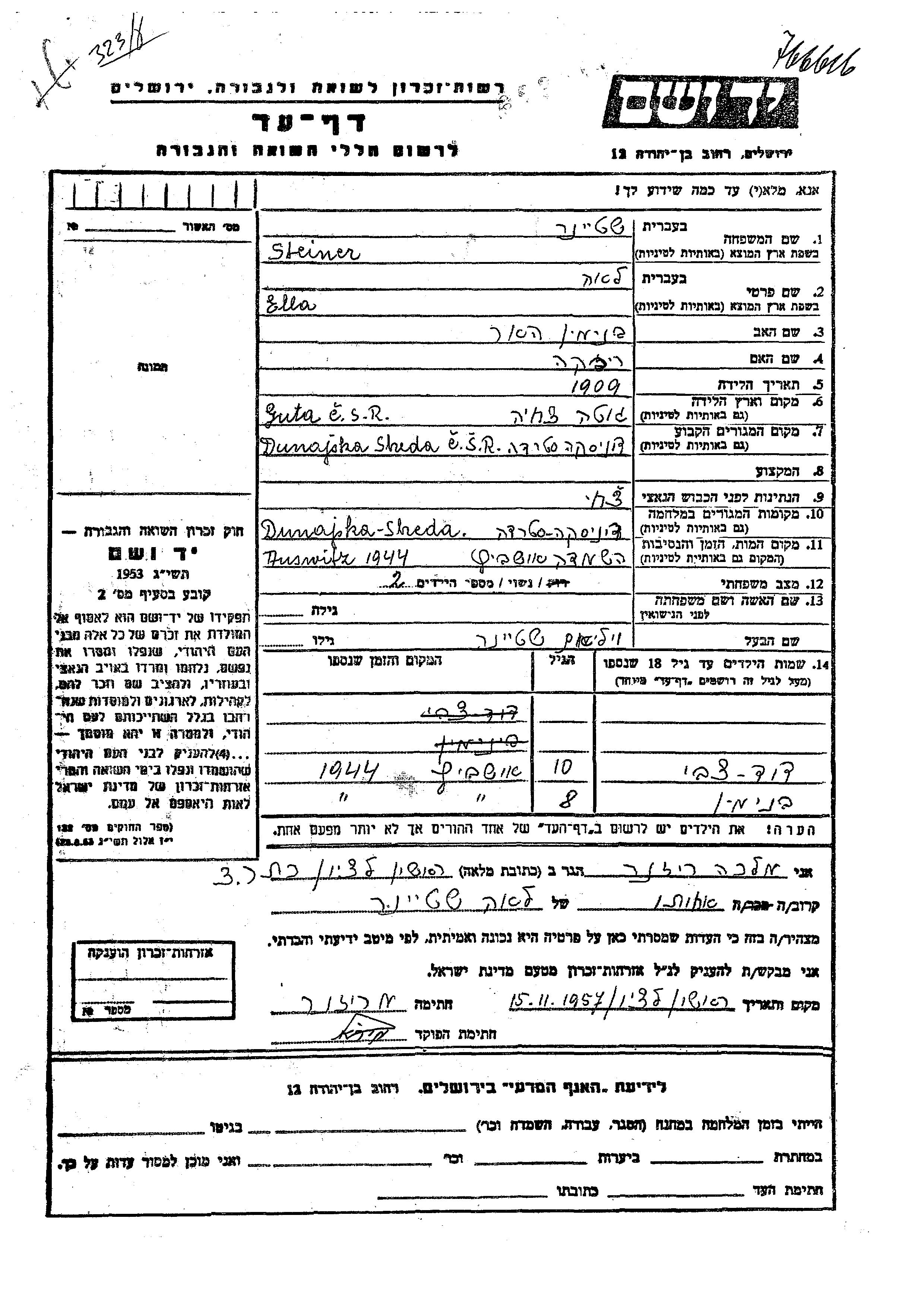 Beniamin Steiner wurde Er war der Sohn von Viliam und Ella Lea, geb. Har. Er war Kind. Vor dem Zweiten Weltkrieg lebte er in Dunajska Streda, Tschechoslowakei. Während des Krieges war er in Dunajska Streda, Tschechoslowakei.
