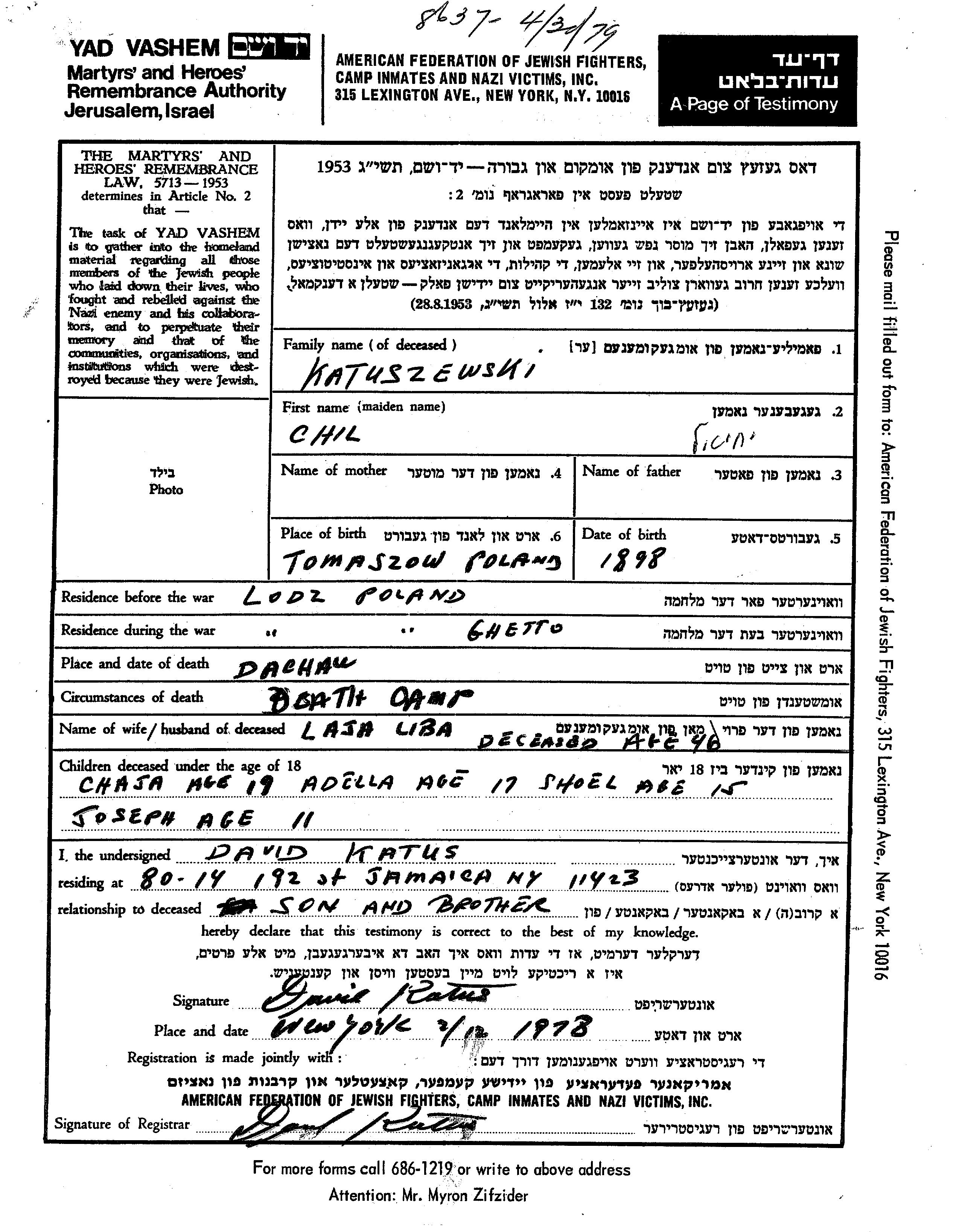 Joseph Katuszewski wurde Er war der Sohn von Chil und Laja Liba. Er war Kind. Vor dem Zweiten Weltkrieg lebte er in Lodz, Polen. Während des Krieges war er in Lodz, Polen.