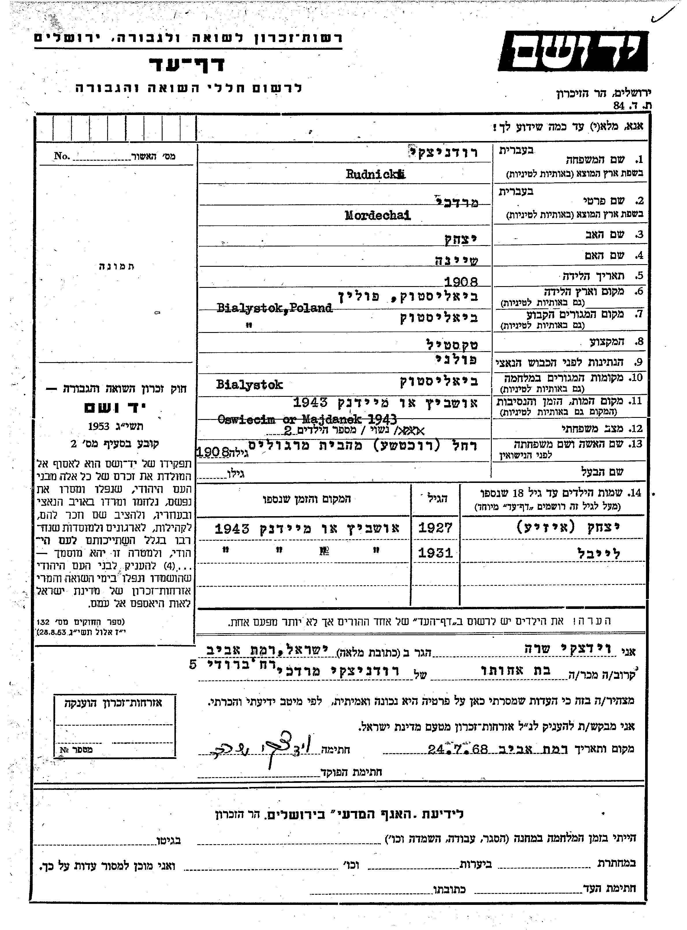 Rudnicki Yitzkhak 1927 Bialystok, Polen Gedenkblatt