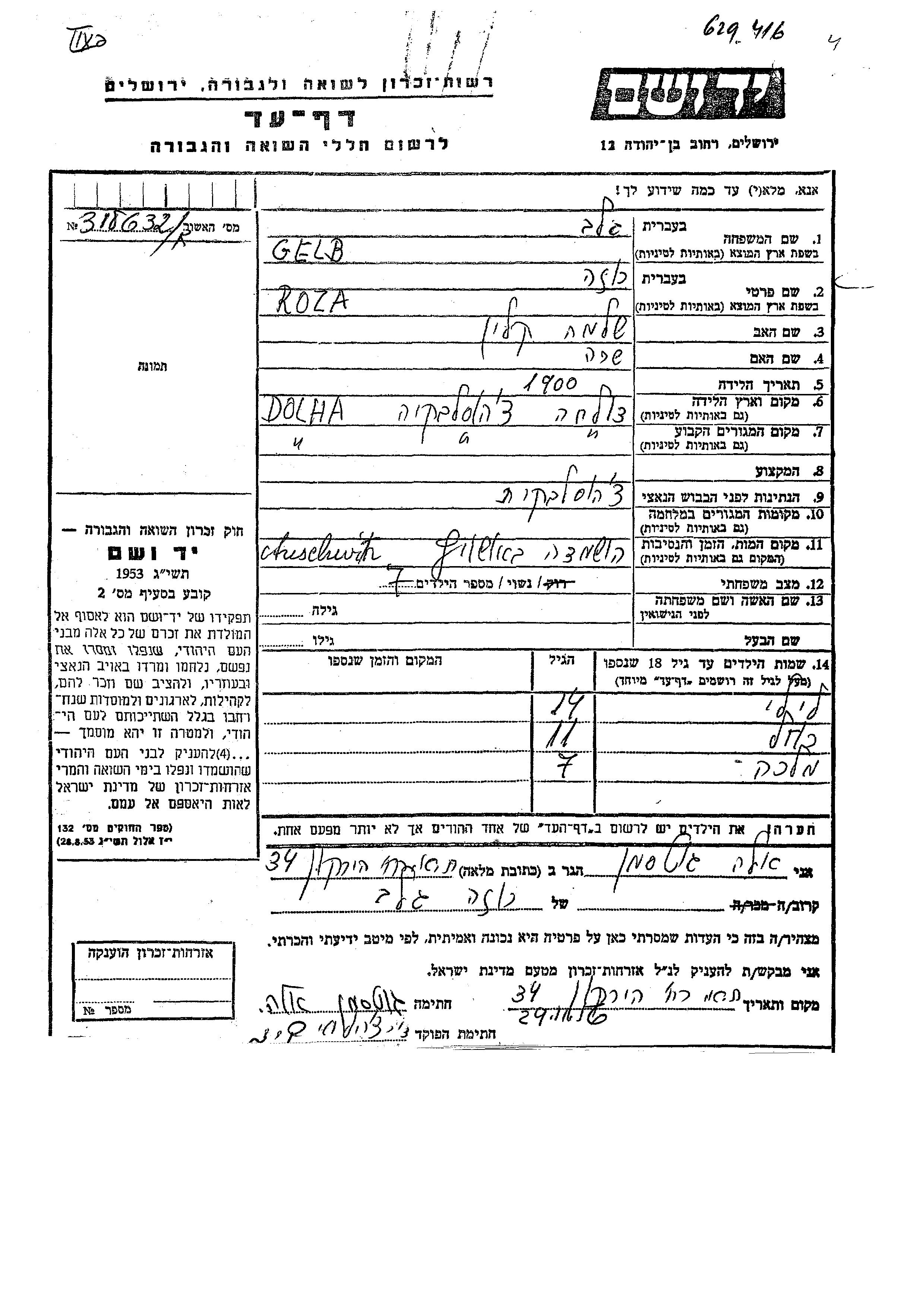 Lili Gelb wurde Sie war die Tochter von Roza, geb. Kalin. Sie war Kind. Vor dem Zweiten Weltkrieg lebte sie in Dolha, Tschechoslowakei.