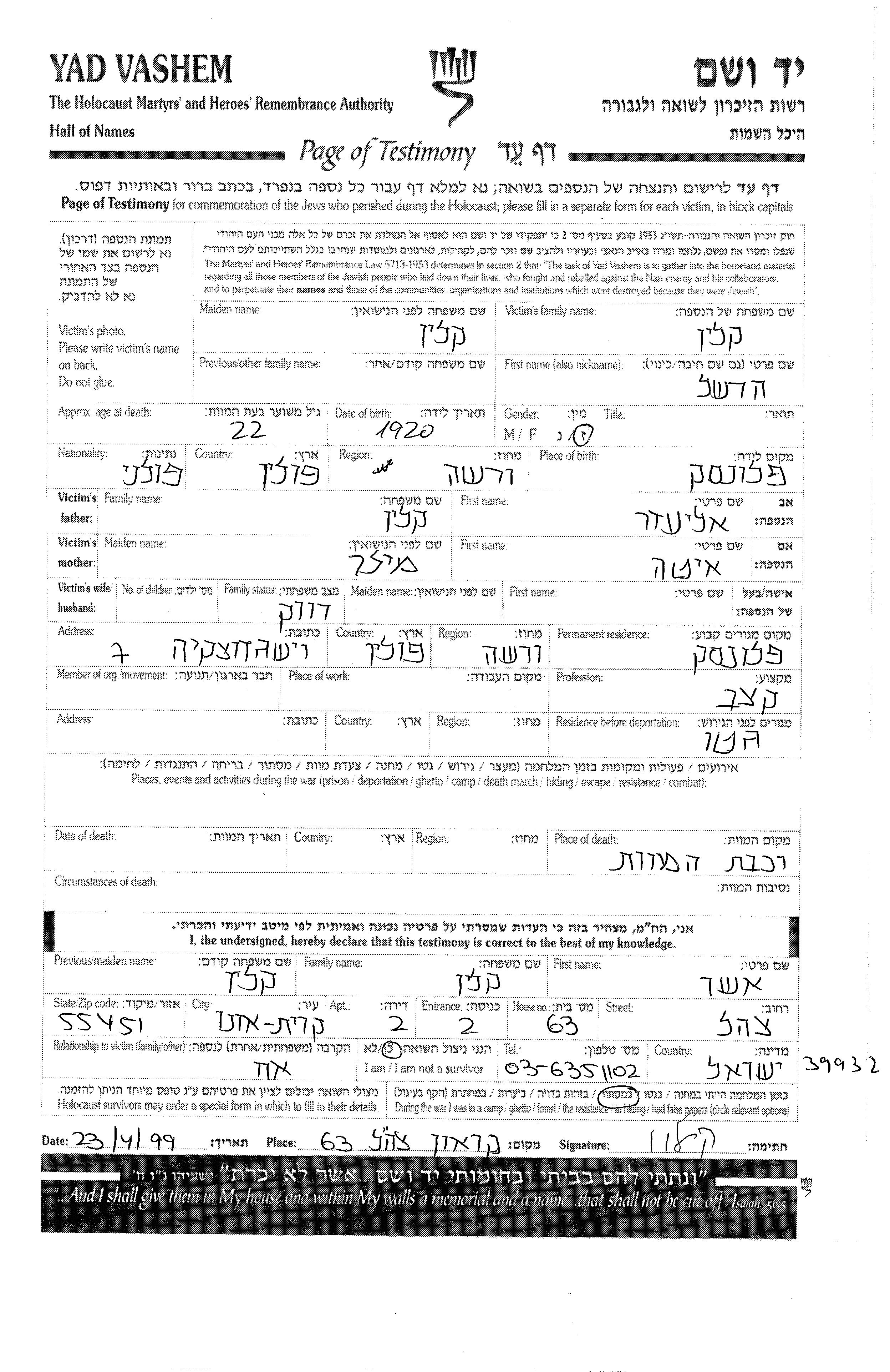 Hershel Klein wurde im Jahr 1920 in Plonsk, Polen geboren. Er war der Sohn von Eliezer und Ita, geb. Miler. Er war Metzger/-in und Ledig. Vor dem Zweiten Weltkrieg lebte er in Plonsk, Polen. Während des Krieges war er in Plonsk, Polen.