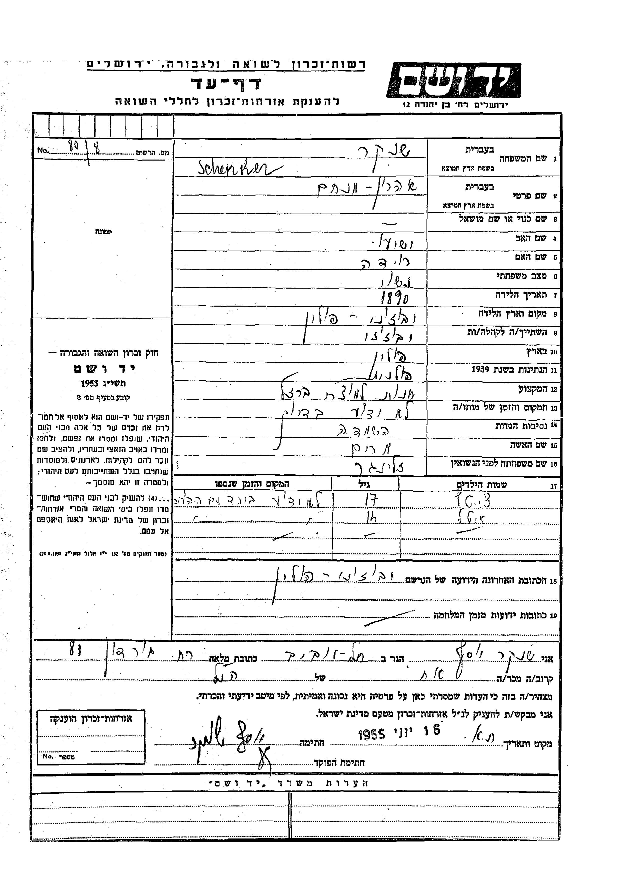 Itel Schenker wurde Sie war die Tochter von Aharon Menakhem und Miriam, geb. Zelinger. Sie war Kind. Vor dem Zweiten Weltkrieg lebte sie in Jaworzno, Polen.