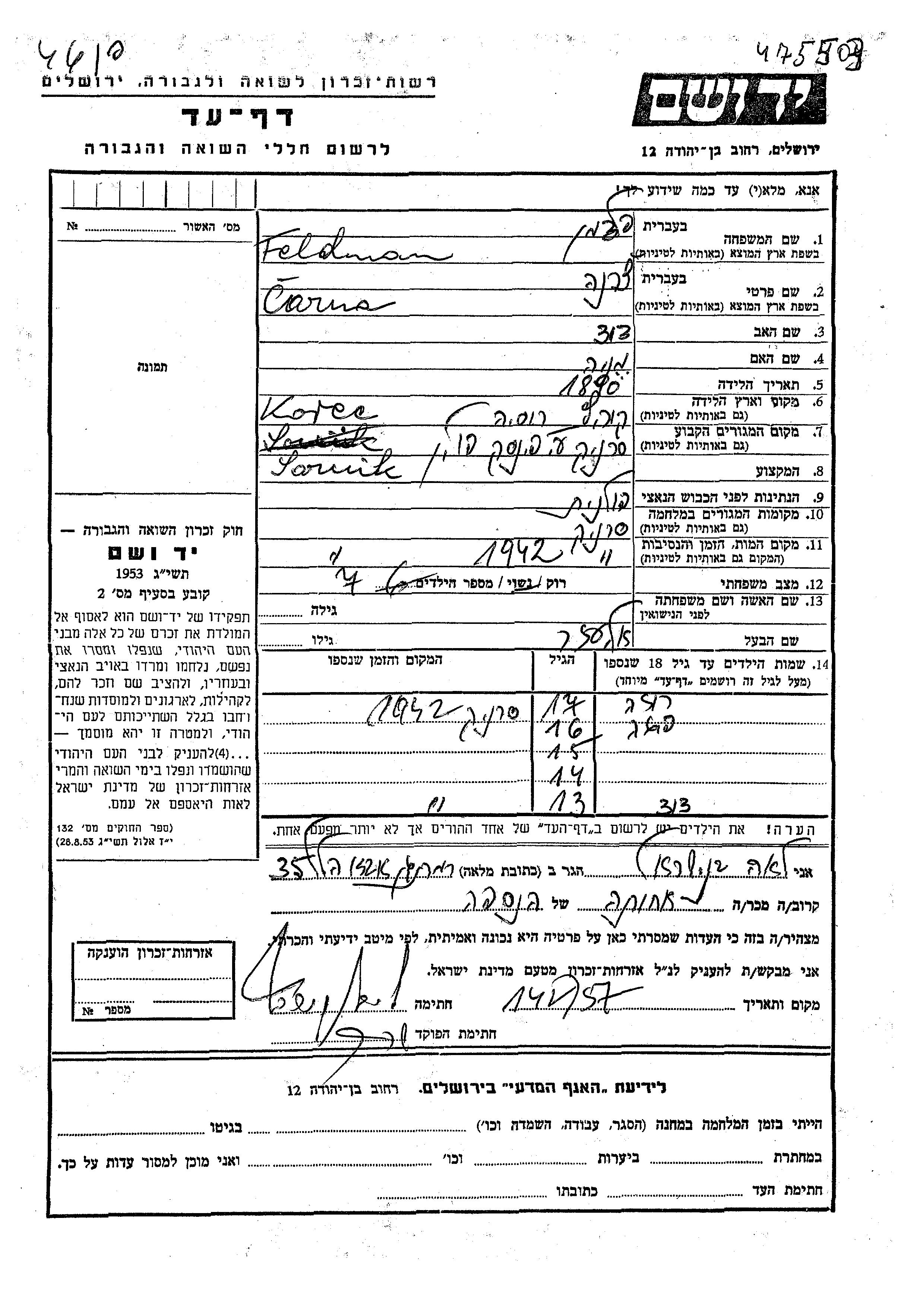 David Feldman wurde Er war der Sohn von Elazar und Carna. Er war Kind. Vor dem Zweiten Weltkrieg lebte er in Sarniki, Polen. Während des Krieges war er in Sarniki, Polen.