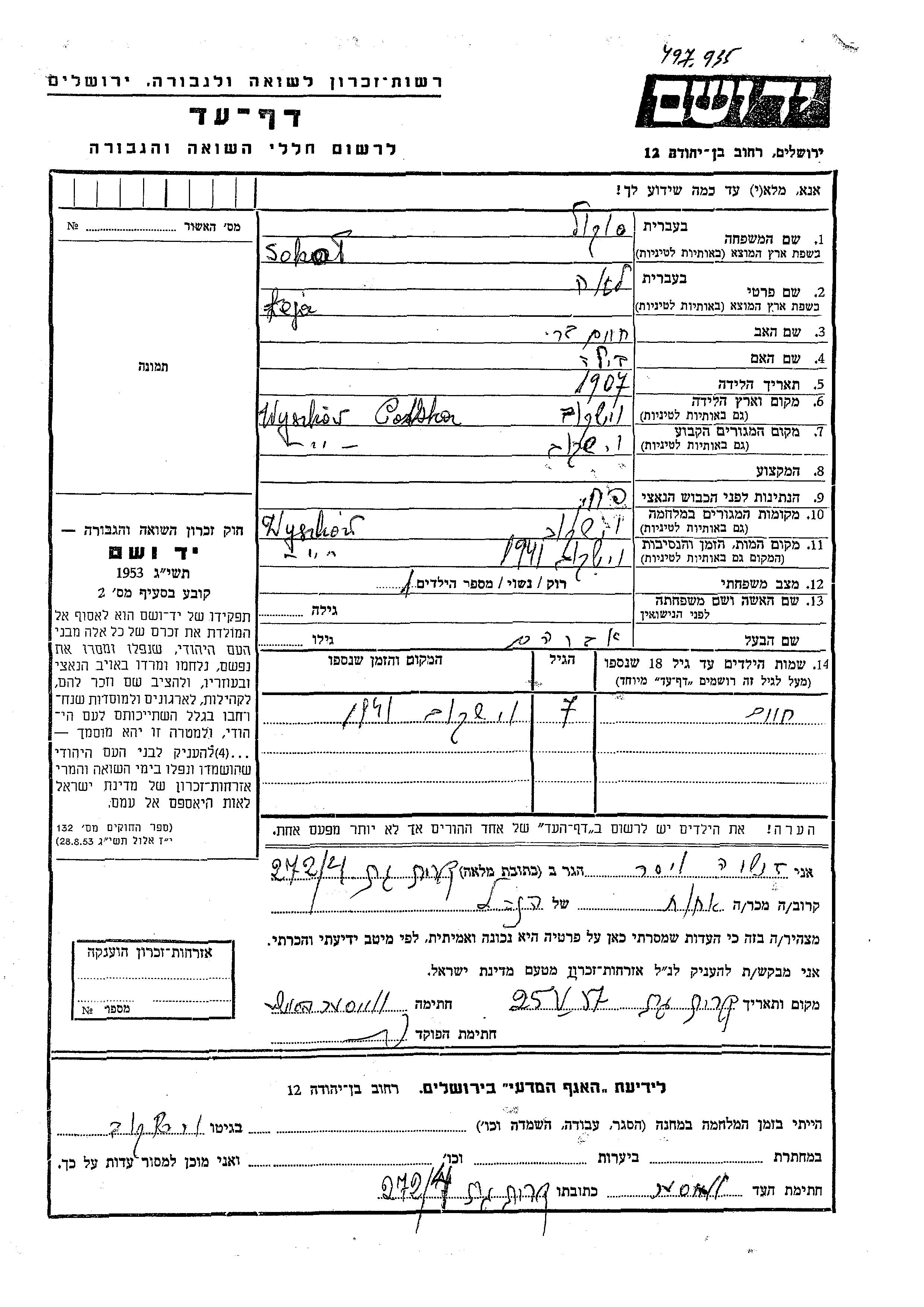 Khaim Sokol wurde Er war der Sohn von Avraham und Leja. Er war Kind. Vor dem Zweiten Weltkrieg lebte er in Wyszkow, Polen. Während des Krieges war er in Wyszkow, Polen.