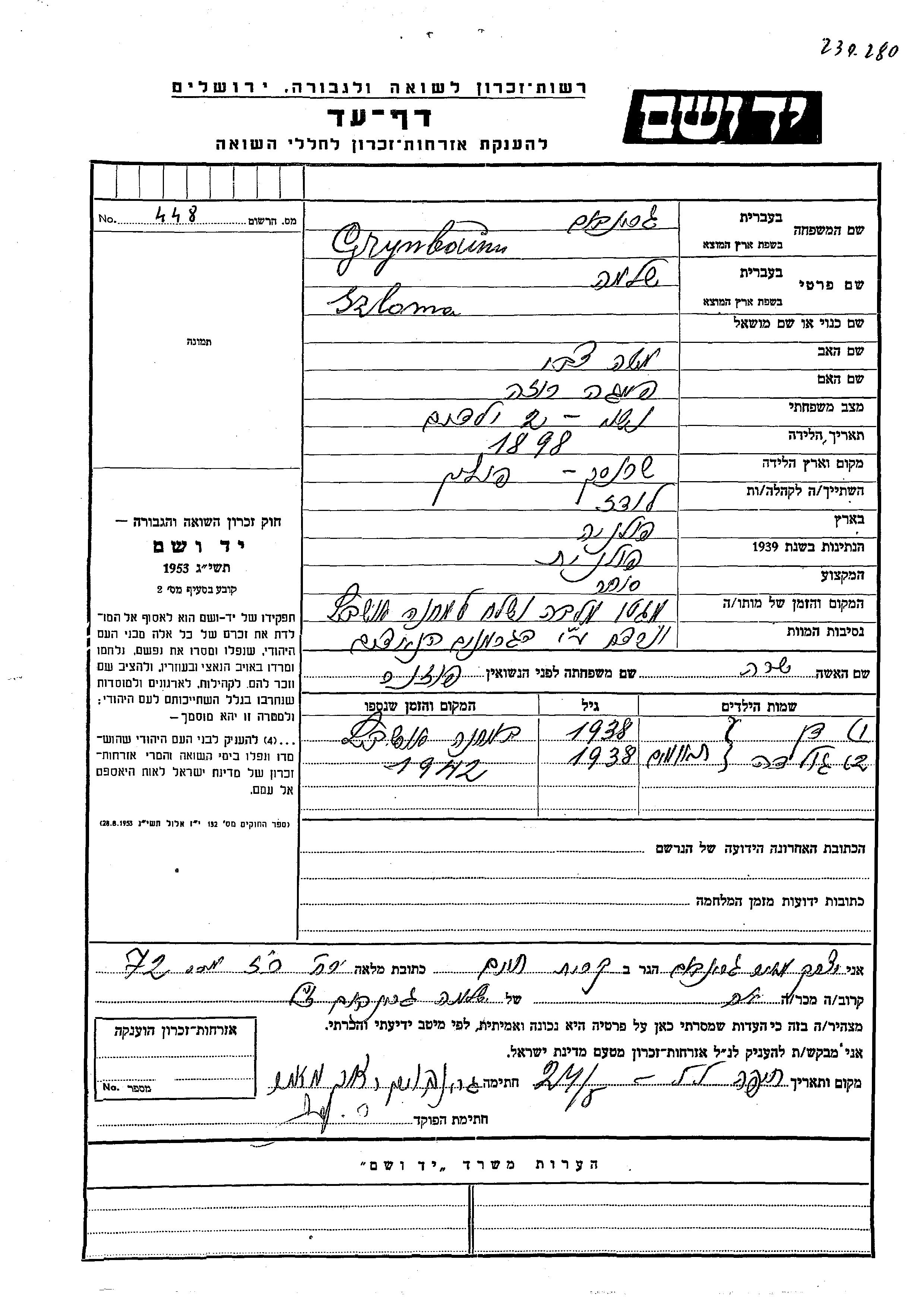 Grynboum Dan 1938 Lodz, Polen Gedenkblatt