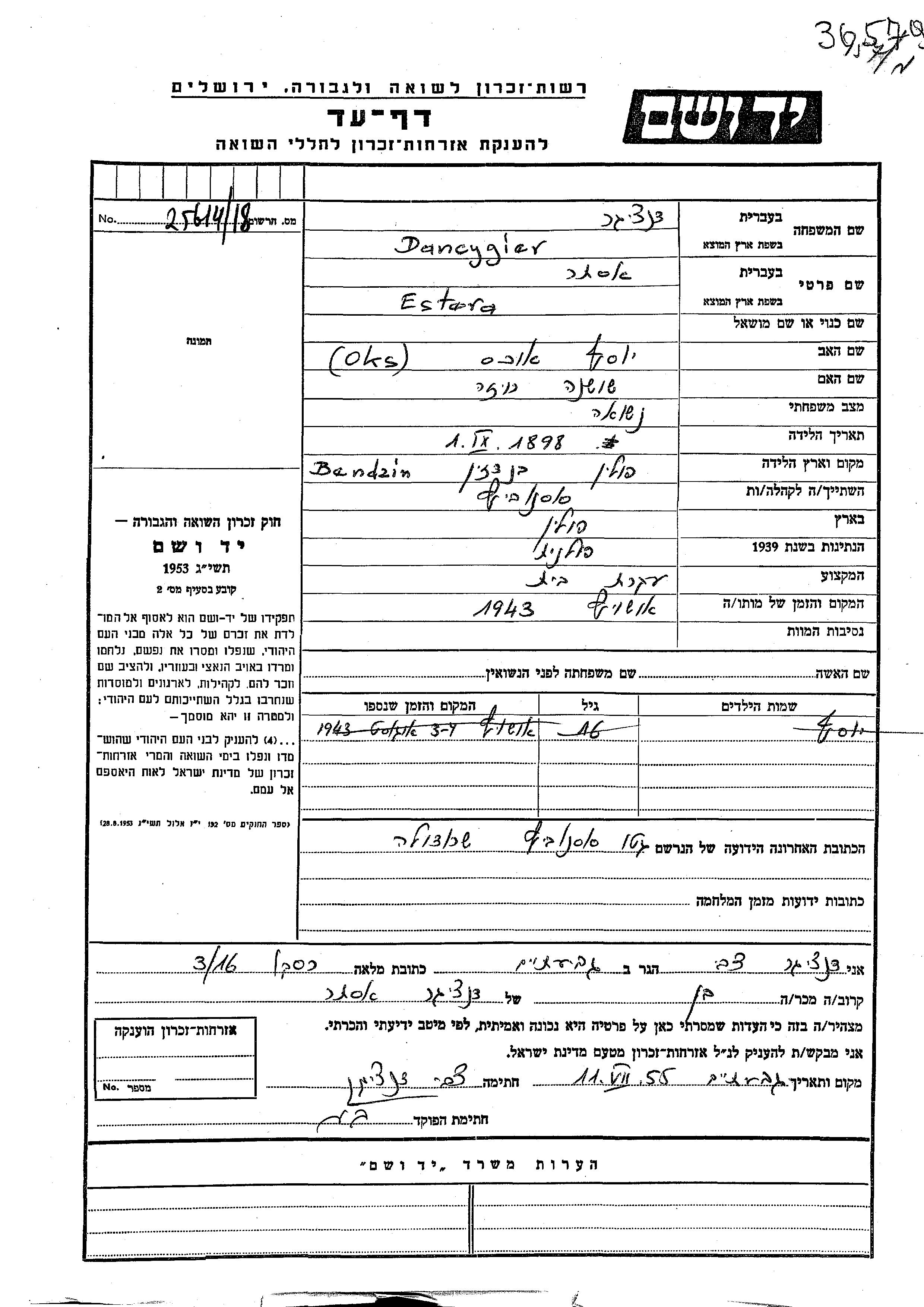 Yosef Dancygier wurde Er war der Sohn von Estera, geb. Oks. Er war Kind. Vor dem Zweiten Weltkrieg lebte er in Sosnowitz, Polen. Während des Krieges war er in Sosnowiec Srodula, Polen.