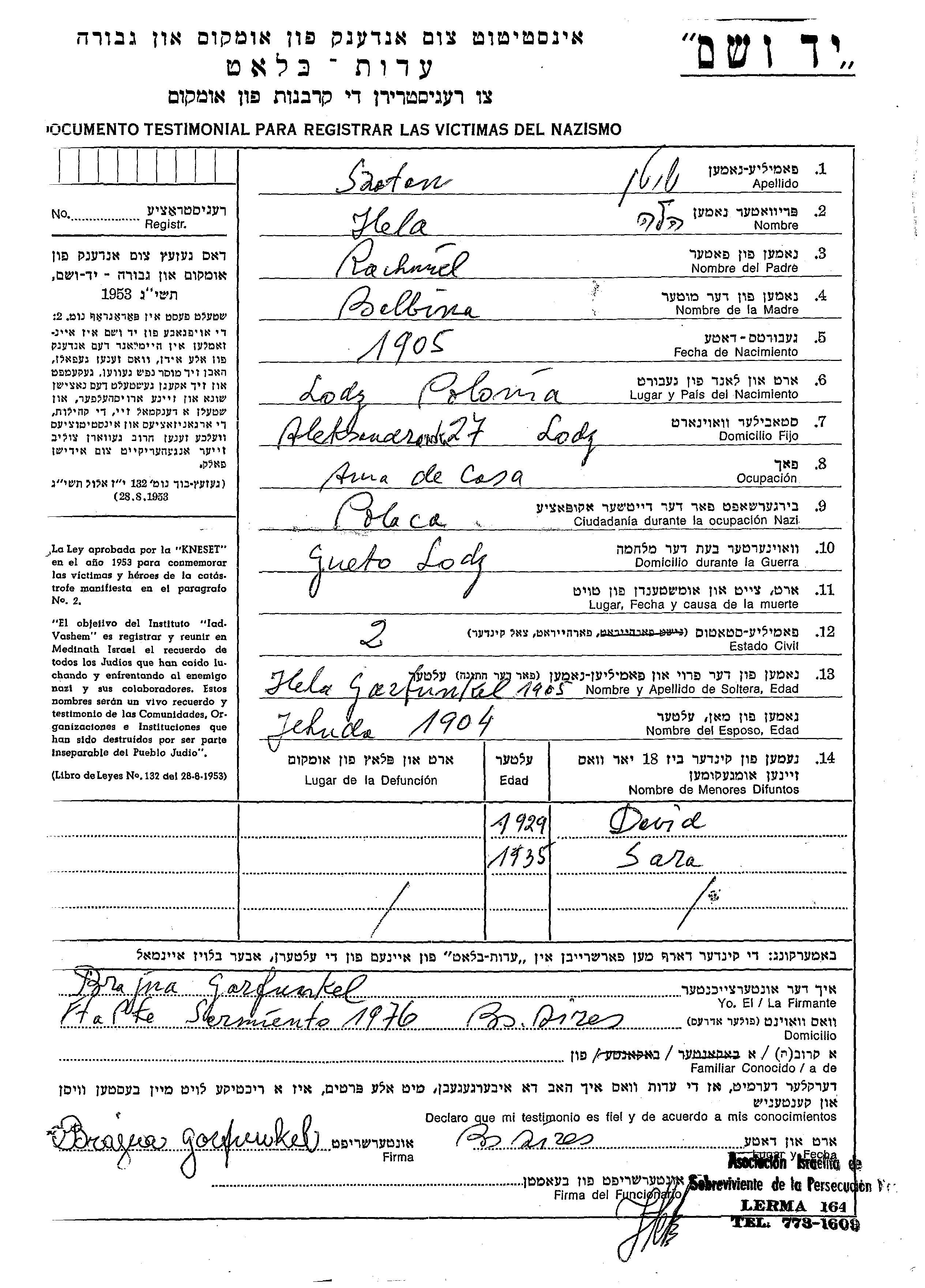 Szoten Sara 1935 Lodz, Polen Gedenkblatt
