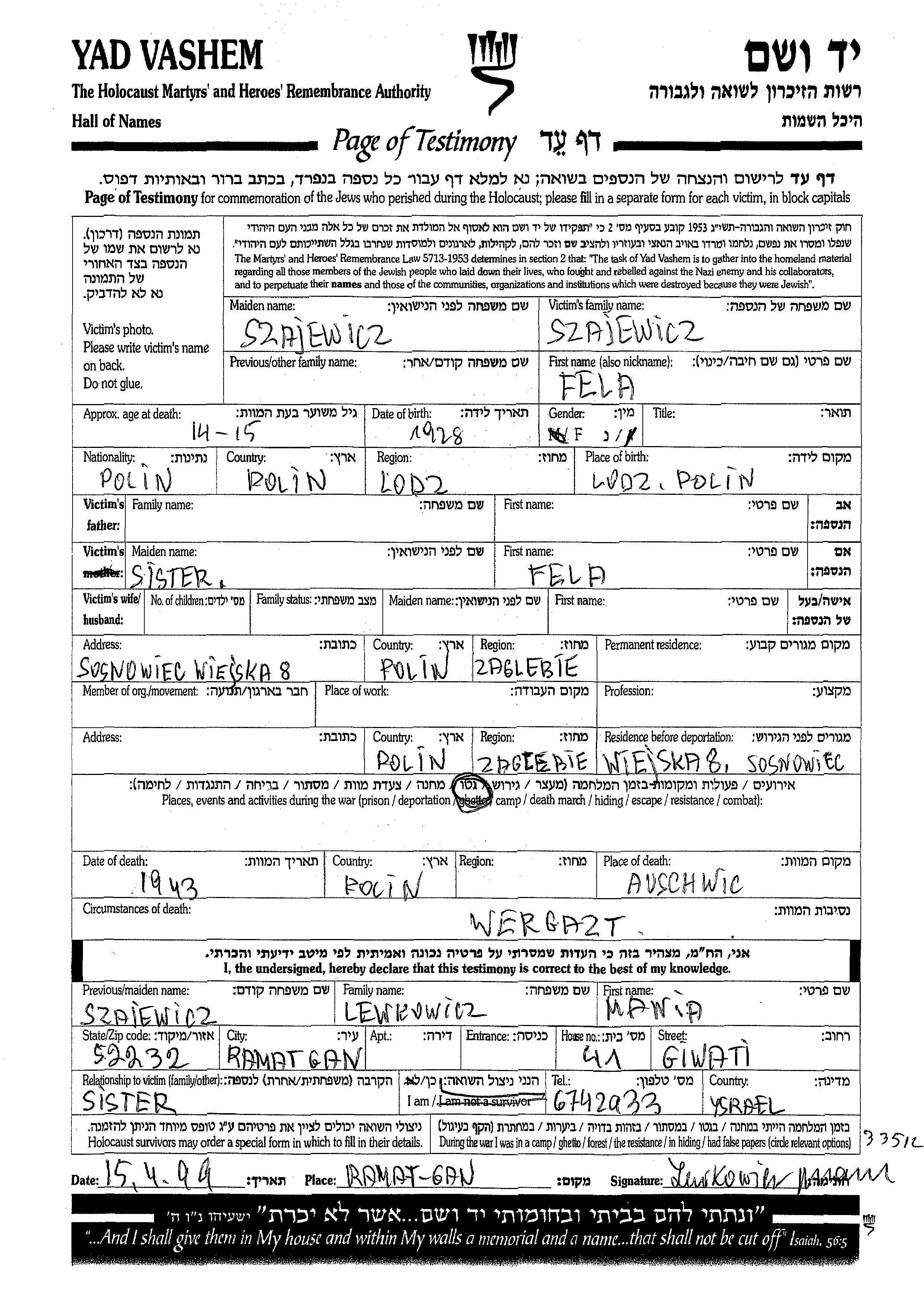 Fela Szajewicz wurde im Jahr 1928 in Lodz, Polen geboren. Sie war die Tochter von Fela. Vor dem Zweiten Weltkrieg lebte sie in Zaglebie Region, Polen. Während des Krieges war sie in Zaglebie Region, Polen.
