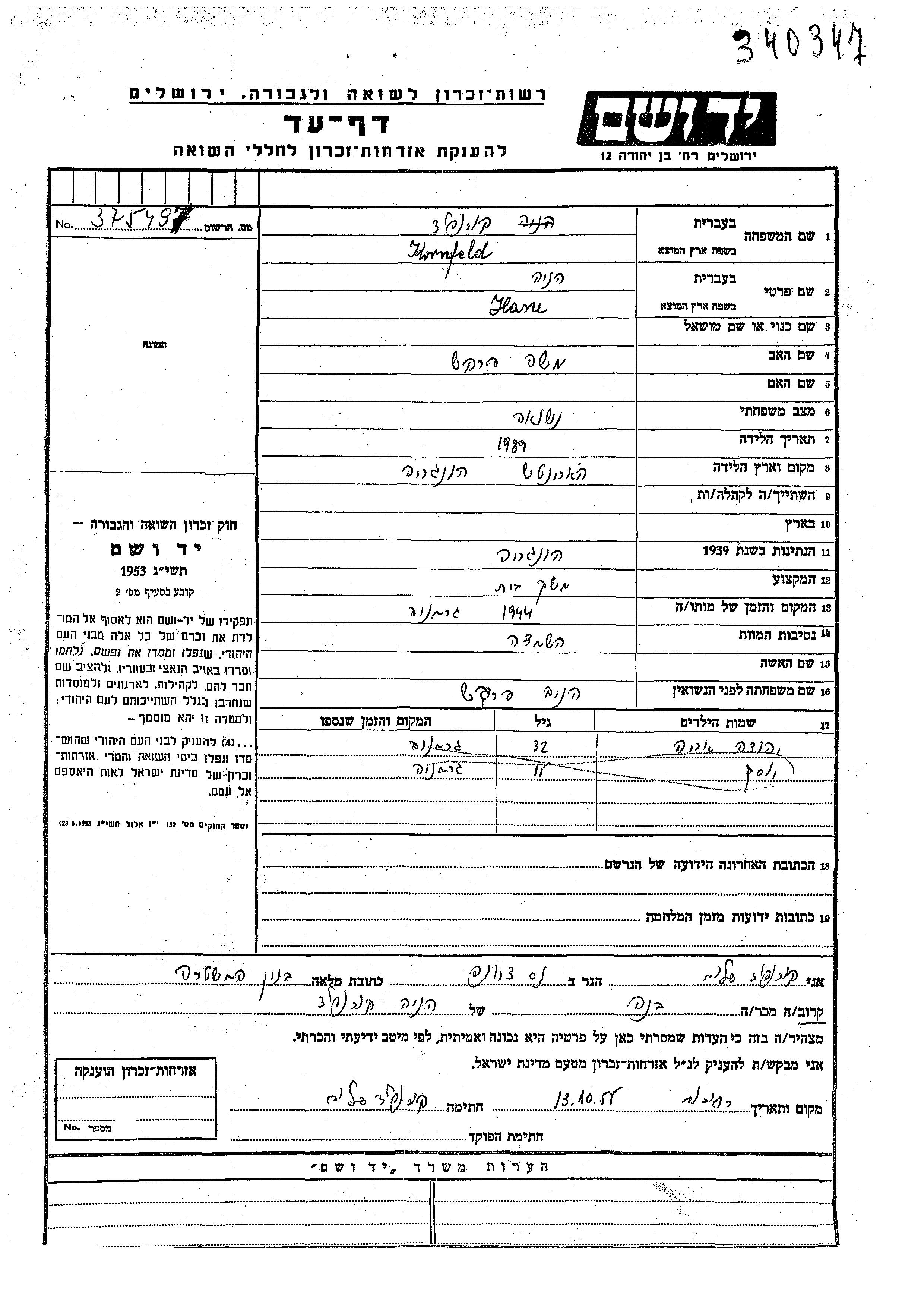Yosef Kornfeld wurde Er war der Sohn von Hane Henia, geb. Farkash. Er war Kind.