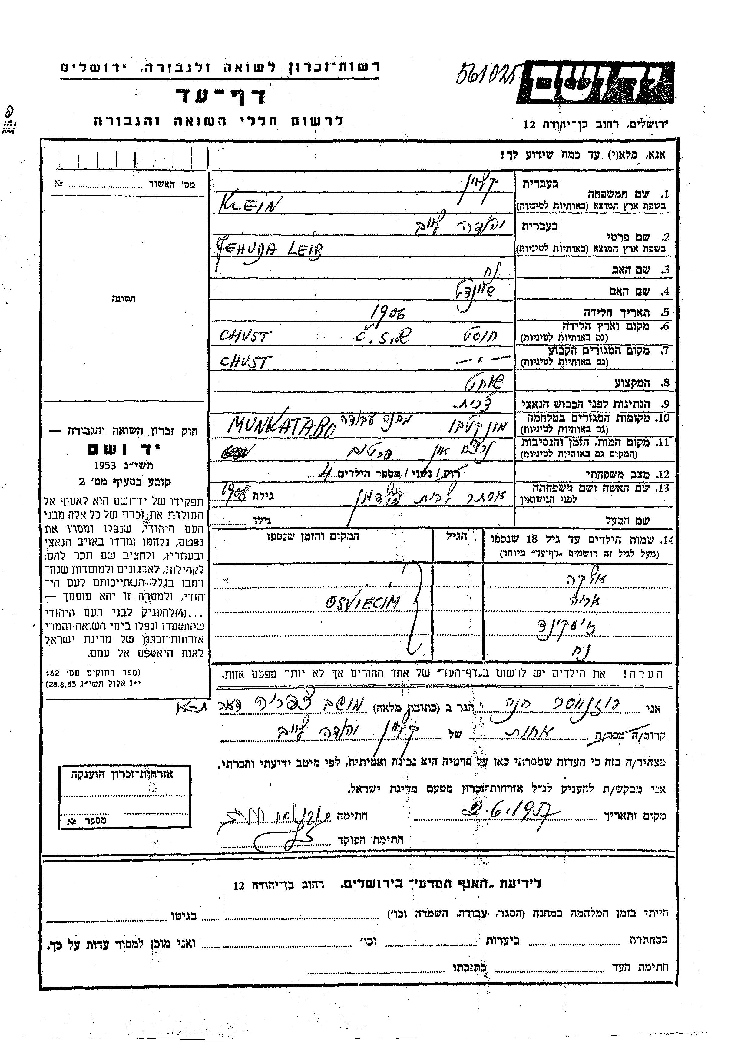 Noakh Klein wurde Er/sie war der/ die Sohn/Tochter von Jehuda Leib und Ester, geb. Feldman. Er/Sie war Kind. Vor dem Zweiten Weltkrieg er/sie in Chust, Tschechoslowakei. Während des Krieges war er/sie in Munkacs, Tschechoslowakei.