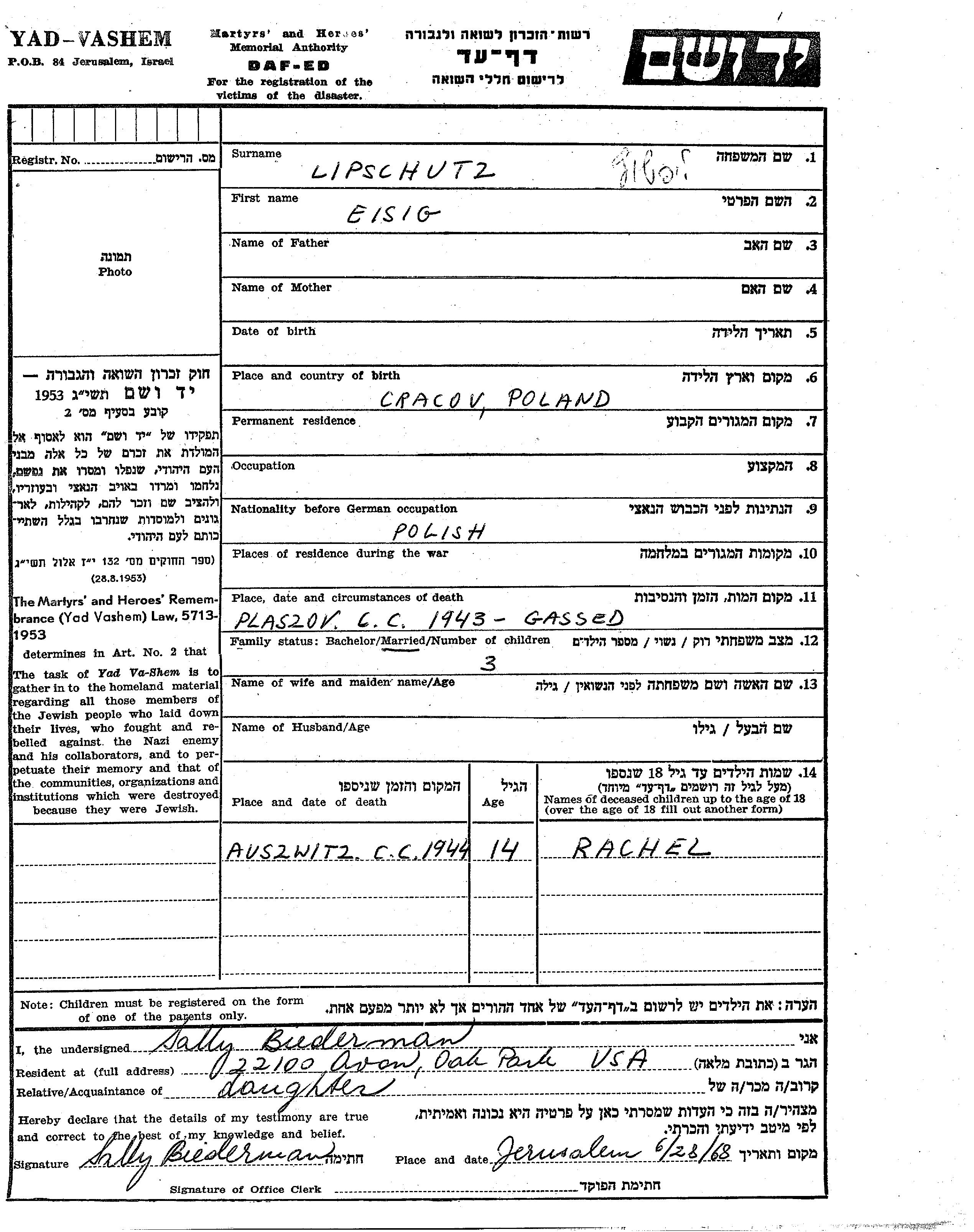Lipschutz Rachel unbekannter Ort, Gedenkblatt