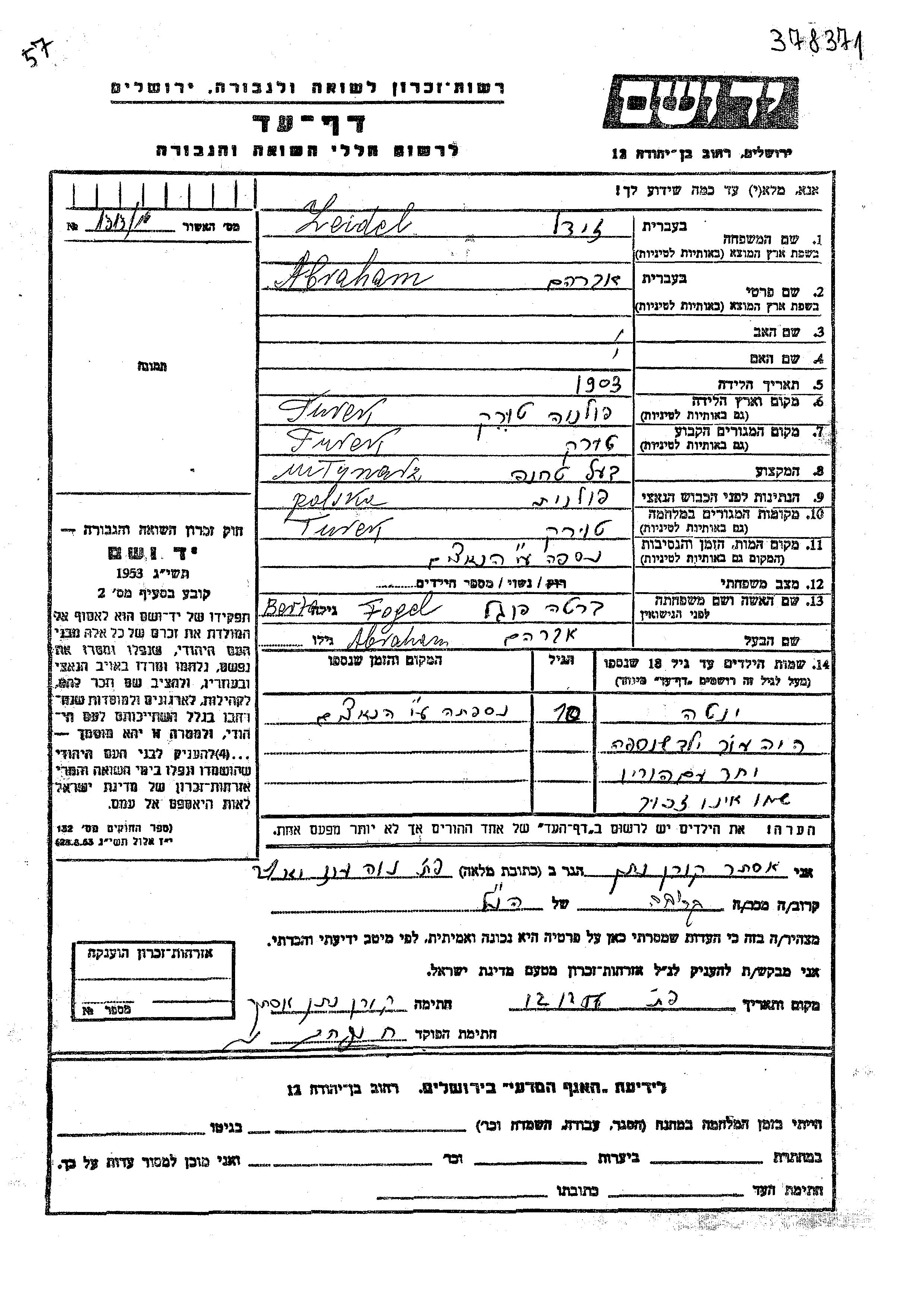 Yenta Zeidel wurde Sie war die Tochter von Abraham und Berta, geb. Fogel. Sie war Kind. Vor dem Zweiten Weltkrieg lebte sie in Turek, Polen. Während des Krieges war sie in Turek, Polen.