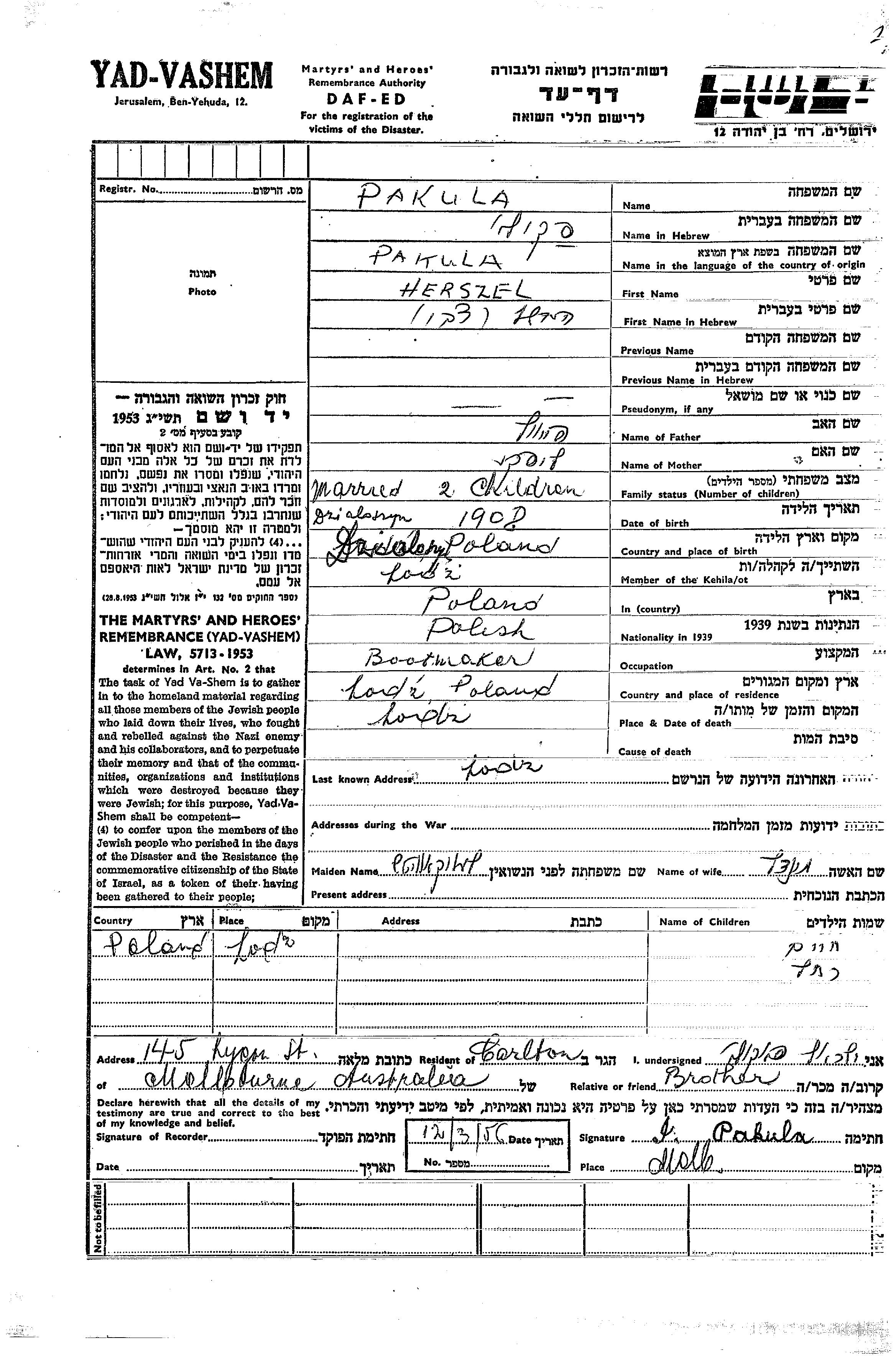 Rakhel Pakula wurde Sie war die Tochter von Herszel Tzvi und Mindl, geb. Levkovitz. Sie war Kind. Vor dem Zweiten Weltkrieg lebte sie in Lodz, Polen. Während des Krieges war sie in Lodz, Polen.