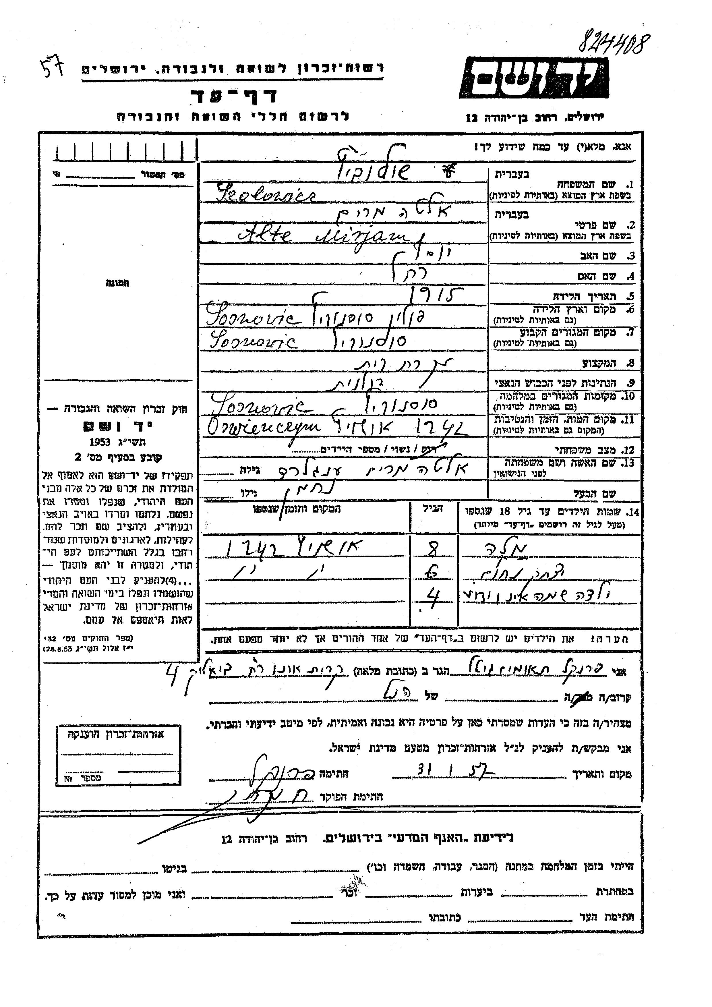 Vorname unbekannt Szolowicz wurde Er/sie war der/ die Sohn/Tochter von Nakhman und Mirjam Alte, geb. Englard. Er/Sie war Kind. Vor dem Zweiten Weltkrieg er/sie in Sosnowic, Polen. Während des Krieges war er/sie in Sosnowic, Polen.