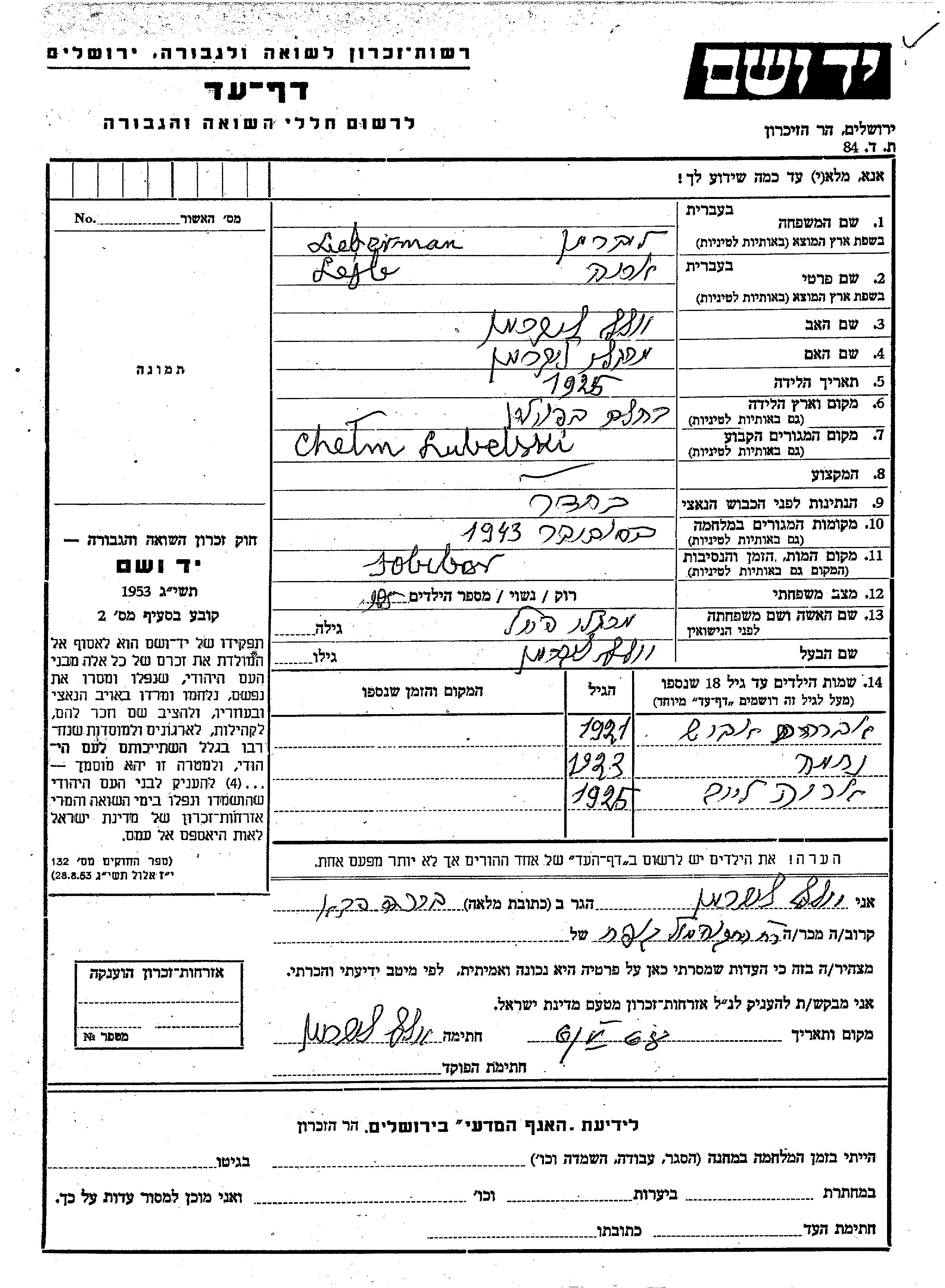 Nekhama Lieberman wurde Er/sie war der/ die Sohn/Tochter von Leyb Arie und Volf, geb. Frol. Vor dem Zweiten Weltkrieg er/sie in Chelm, Polen. Während des Krieges war er/sie in Sobibor, Polen.