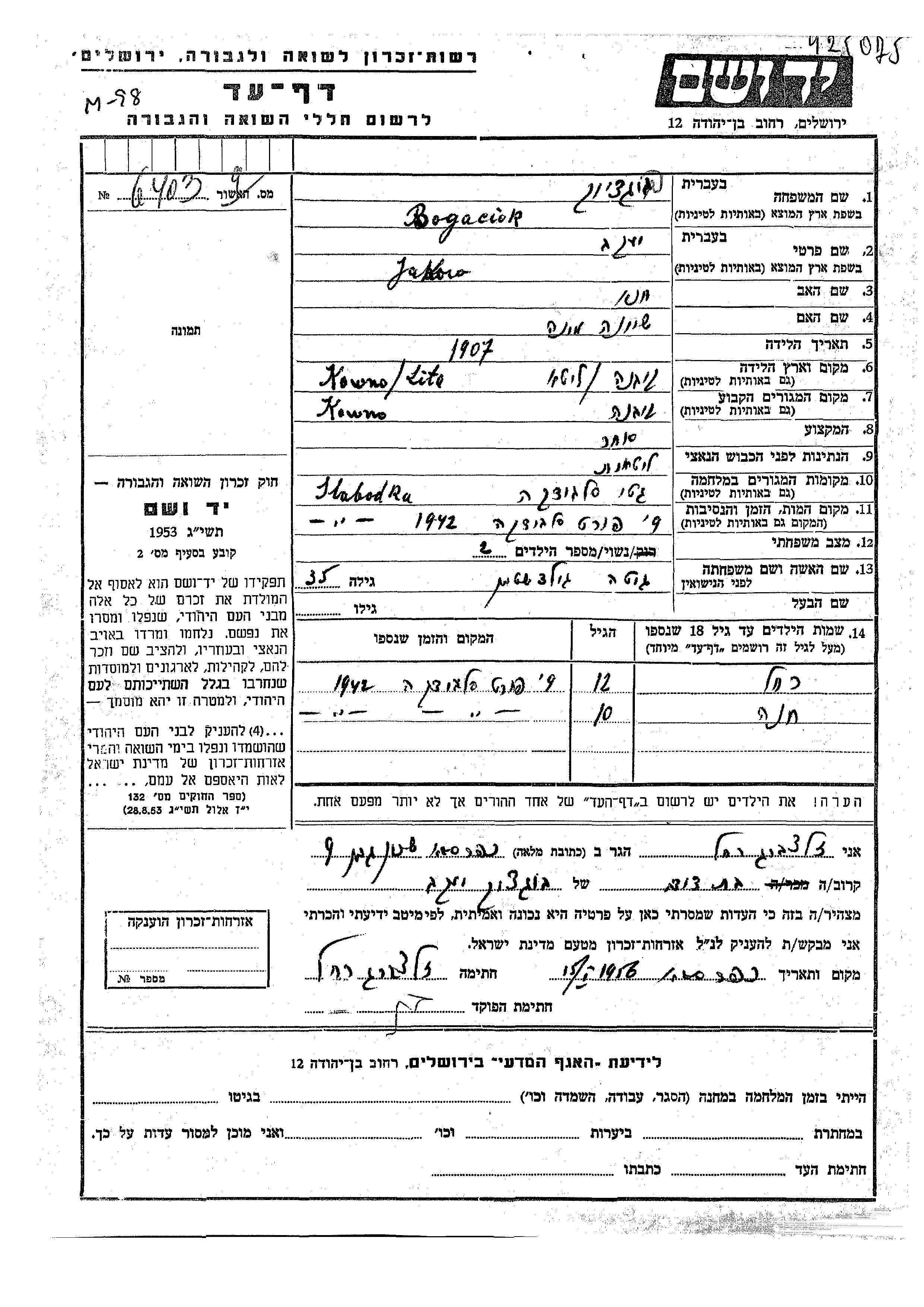 Rakhel Bogaciuk wurde Sie war die Tochter von Jakob und Gita, geb. Goldshtein. Sie war Kind. Vor dem Zweiten Weltkrieg lebte sie in Kowno, Litauen. Während des Krieges war sie in Slabodka, Polen.