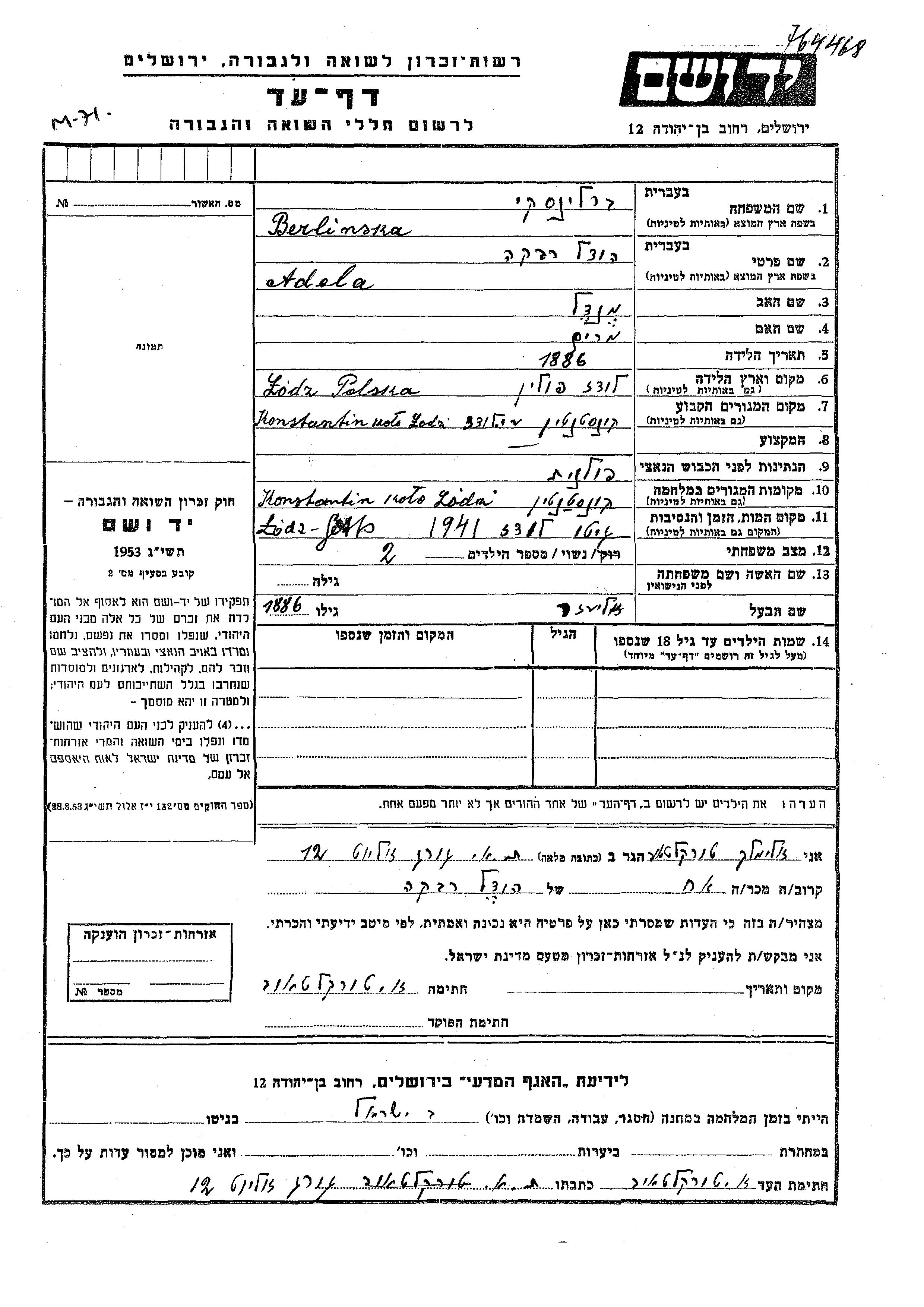 Adela Hudel Rivka Berlinska wurde im Jahr 1886 in Lodz, Polen geboren. Sie war die Tochter von Mendel und Miriam. Sie war mit Eliezer Verheiratet. Vor dem Zweiten Weltkrieg lebte sie in Konstantinov, Polen. Während des Krieges war sie in Konstantinov, Polen.