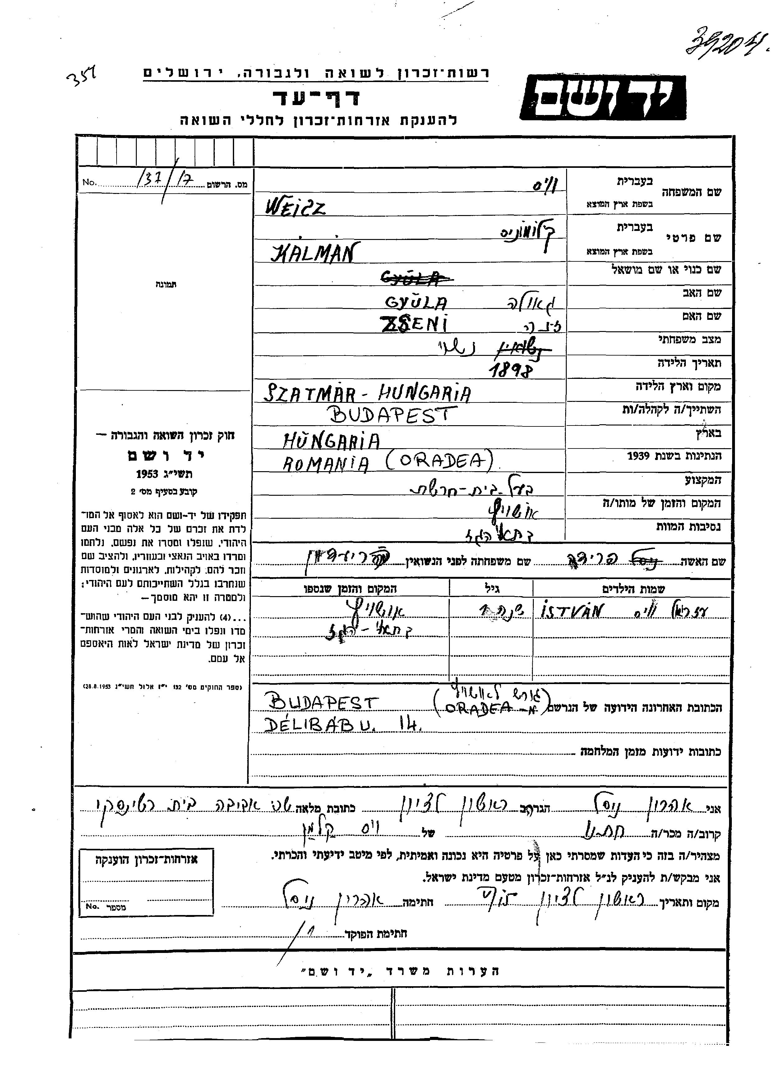Weisz Ishtvan Azriel Budapest, Ungarn Gedenkblatt