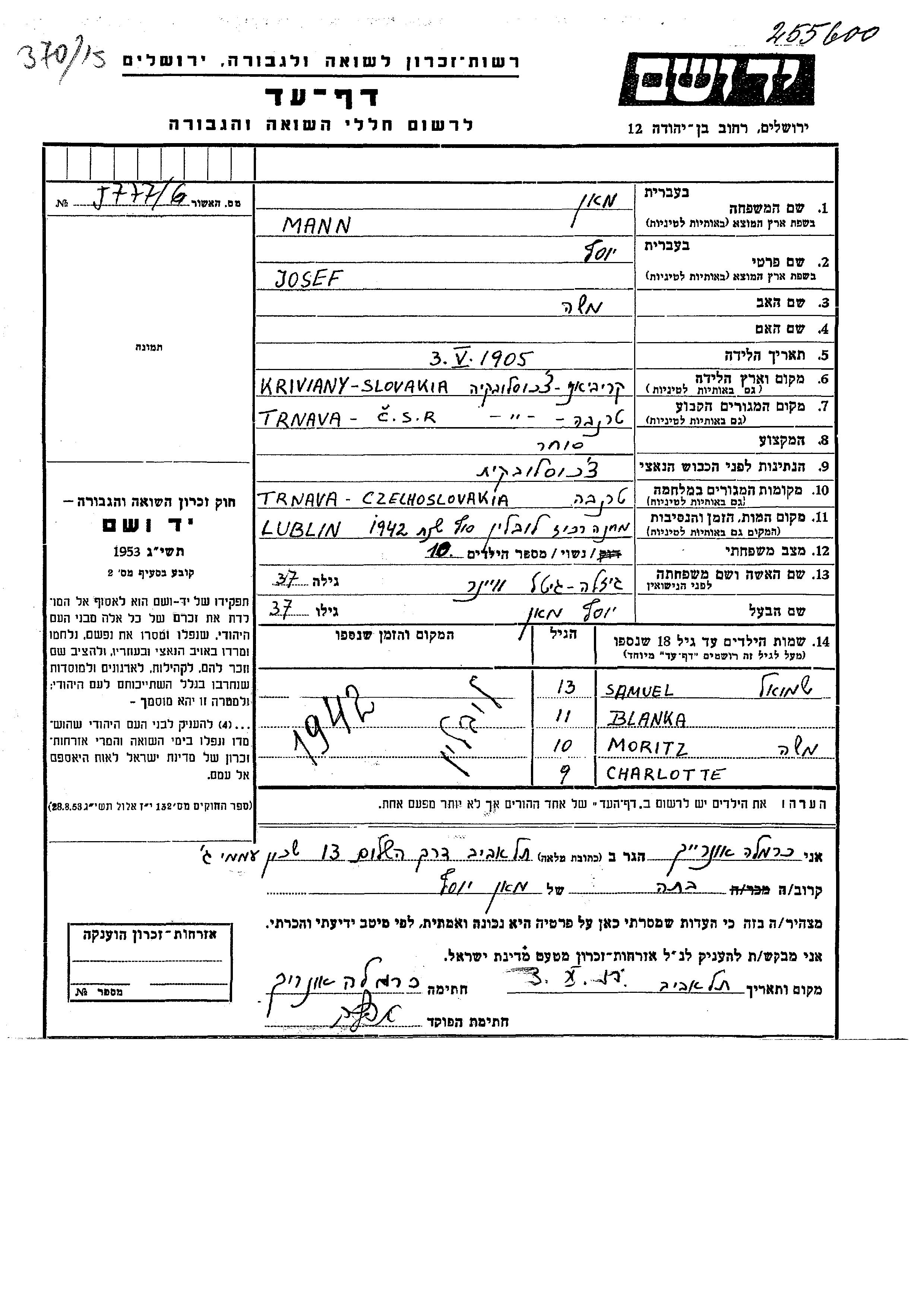 Shmuel Mann wurde Er war der Sohn von Yosef und Gizela Gitel, geb. Viner. Er war Kind. Vor dem Zweiten Weltkrieg lebte er in Trnava, Tschechoslowakei. Während des Krieges war er in Trnava, Tschechoslowakei.