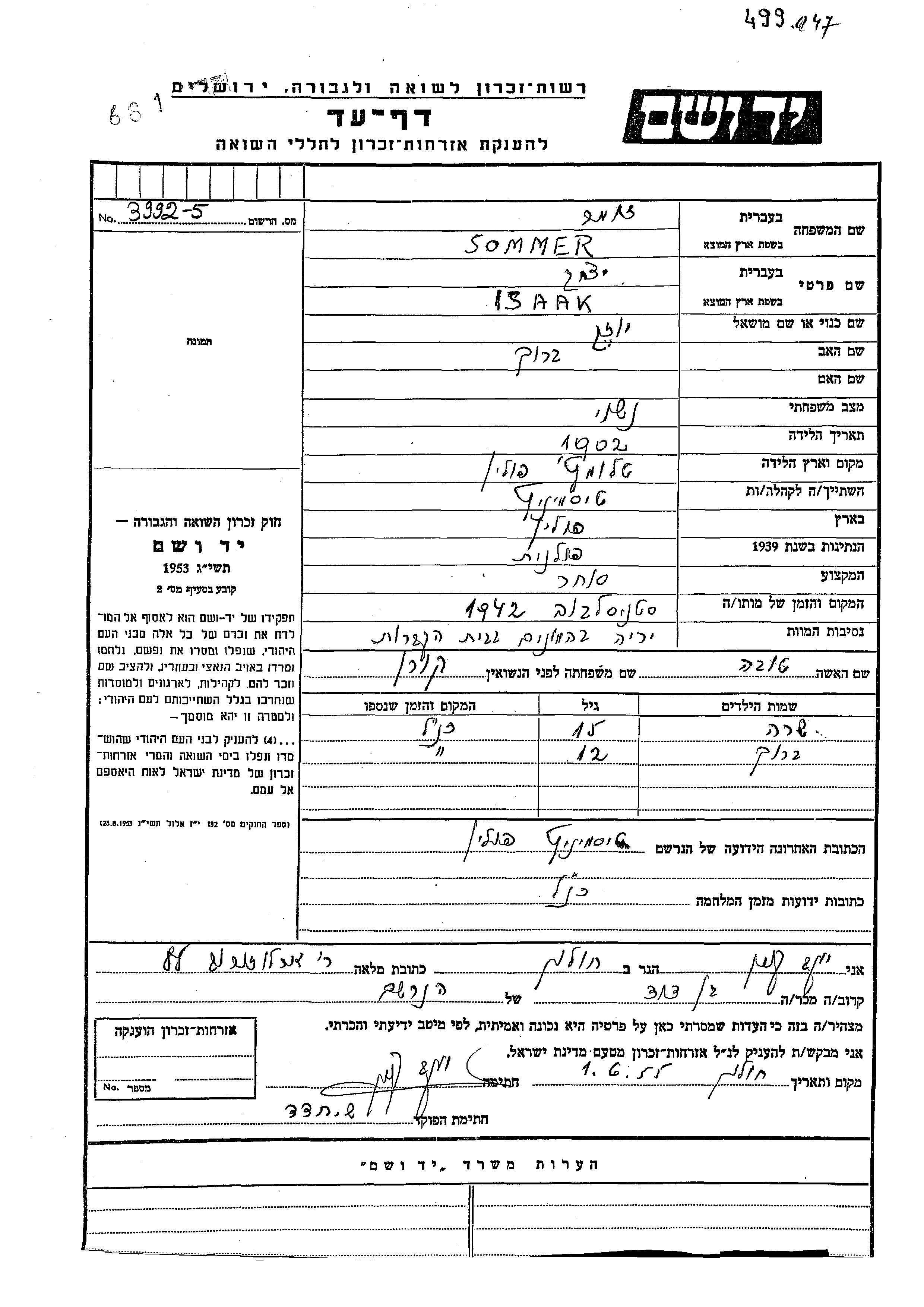 Barukh Sommer wurde Er war der Sohn von Isaak Iozek und Tova, geb. Korn. Er war Kind. Vor dem Zweiten Weltkrieg lebte er in Tismienitz, Polen. Während des Krieges war er in Tismienitz, Polen.