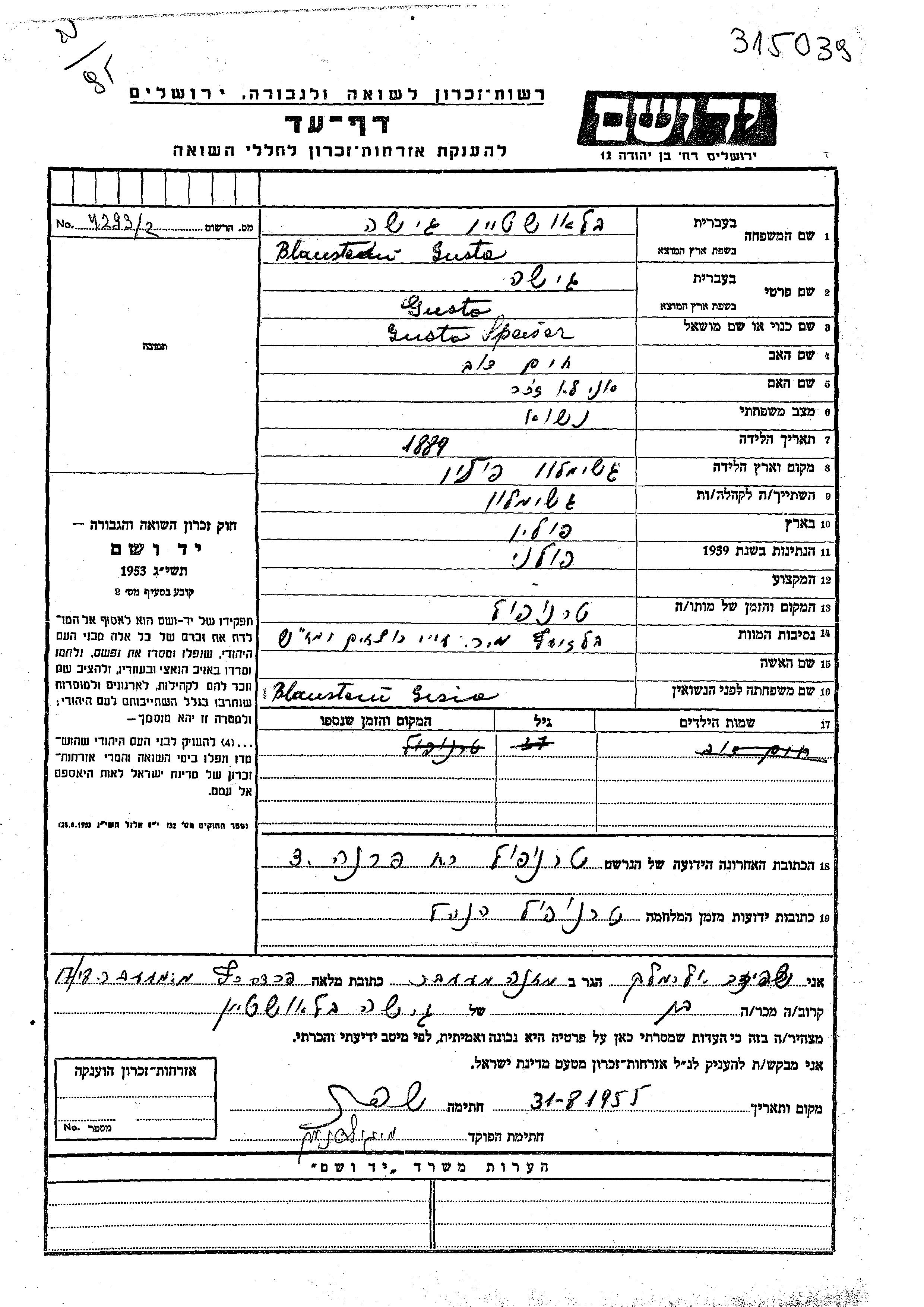 Gusta Guta Speiser, geb. Blaushtein wurde im Jahr 1889 in Grzymalow, Polen geboren. Sie war die Tochter von Khaim Dov. Sie war Verheiratet. Vor dem Zweiten Weltkrieg lebte sie in Grzymalow, Polen. Während des Krieges war sie in Tarnopol, Polen.