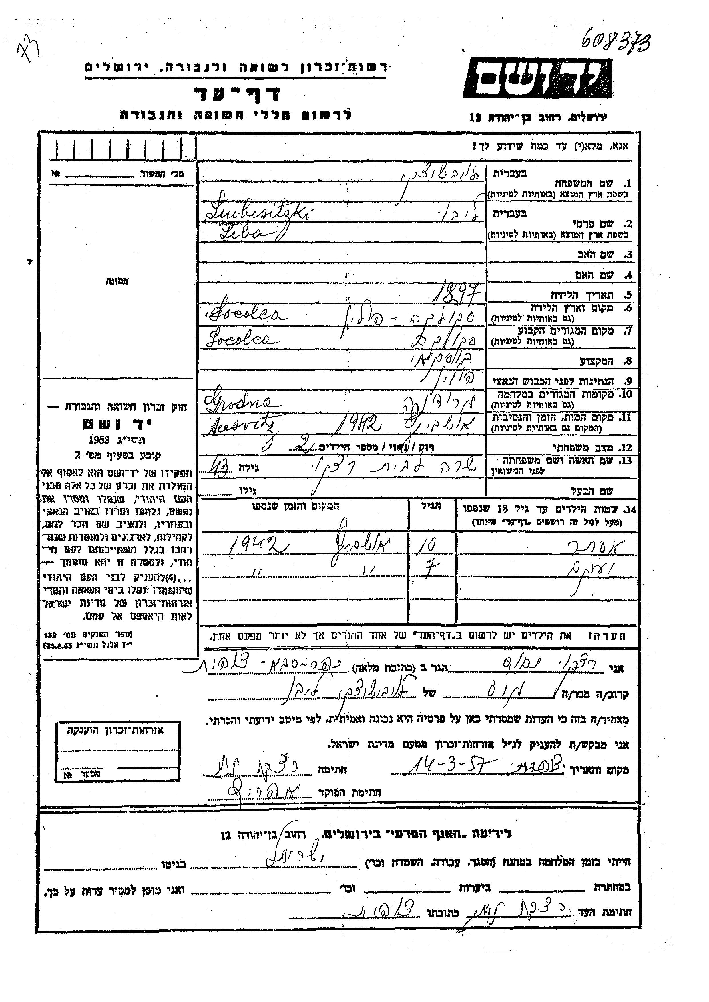 Yaakov Liubisitzki wurde Er war der Sohn von Libo und Sara, geb. Ratzko. Er war Kind. Vor dem Zweiten Weltkrieg lebte er in Sokolka, Polen. Während des Krieges war er in Grodno, Polen.