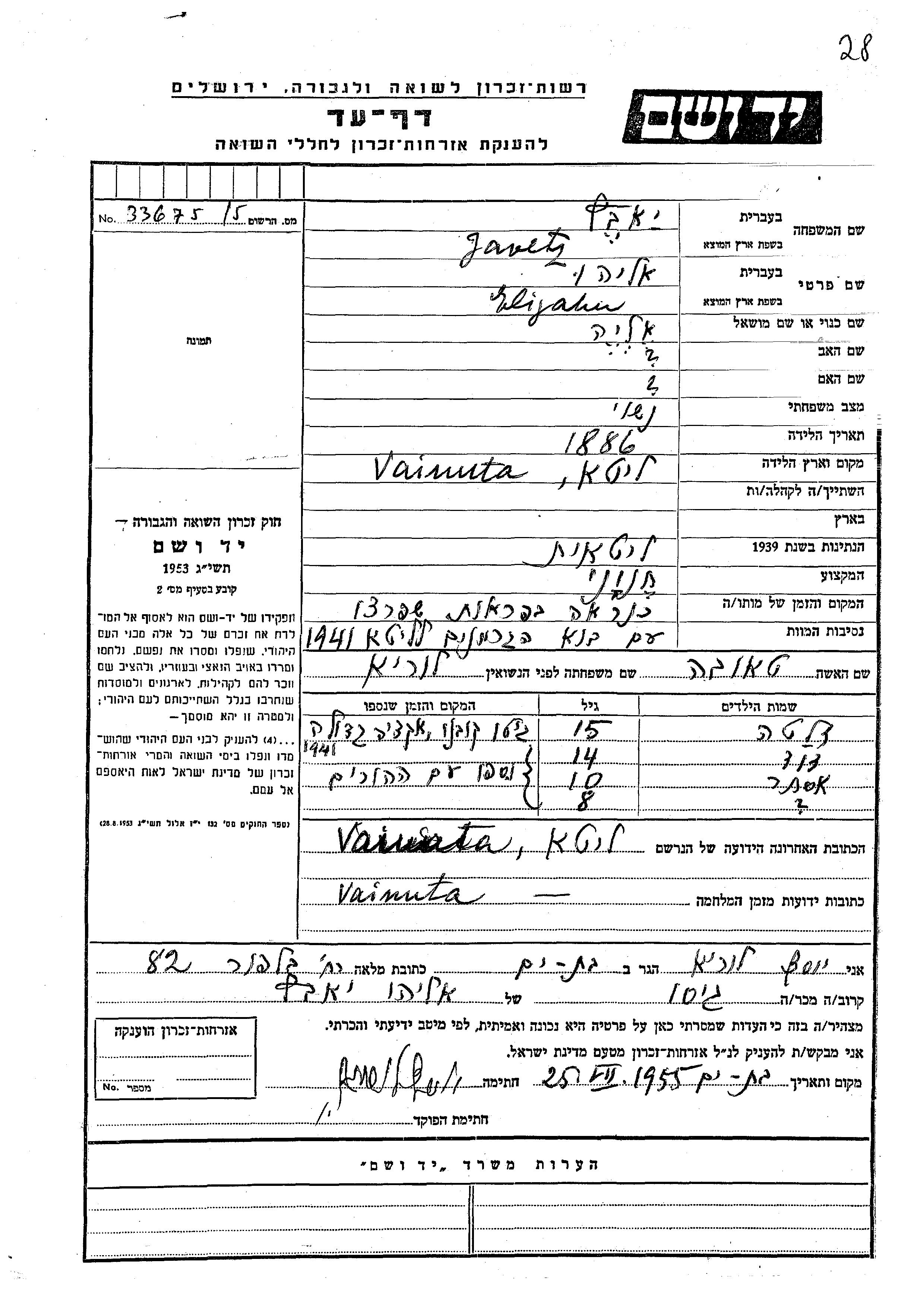 David Javetz wurde Er war der Sohn von Elijahu Alia und Tauba, geb. Lurie. Er war Kind. Vor dem Zweiten Weltkrieg lebte er in Vainuta, Litauen. Während des Krieges war er in Vainutas, Litauen.