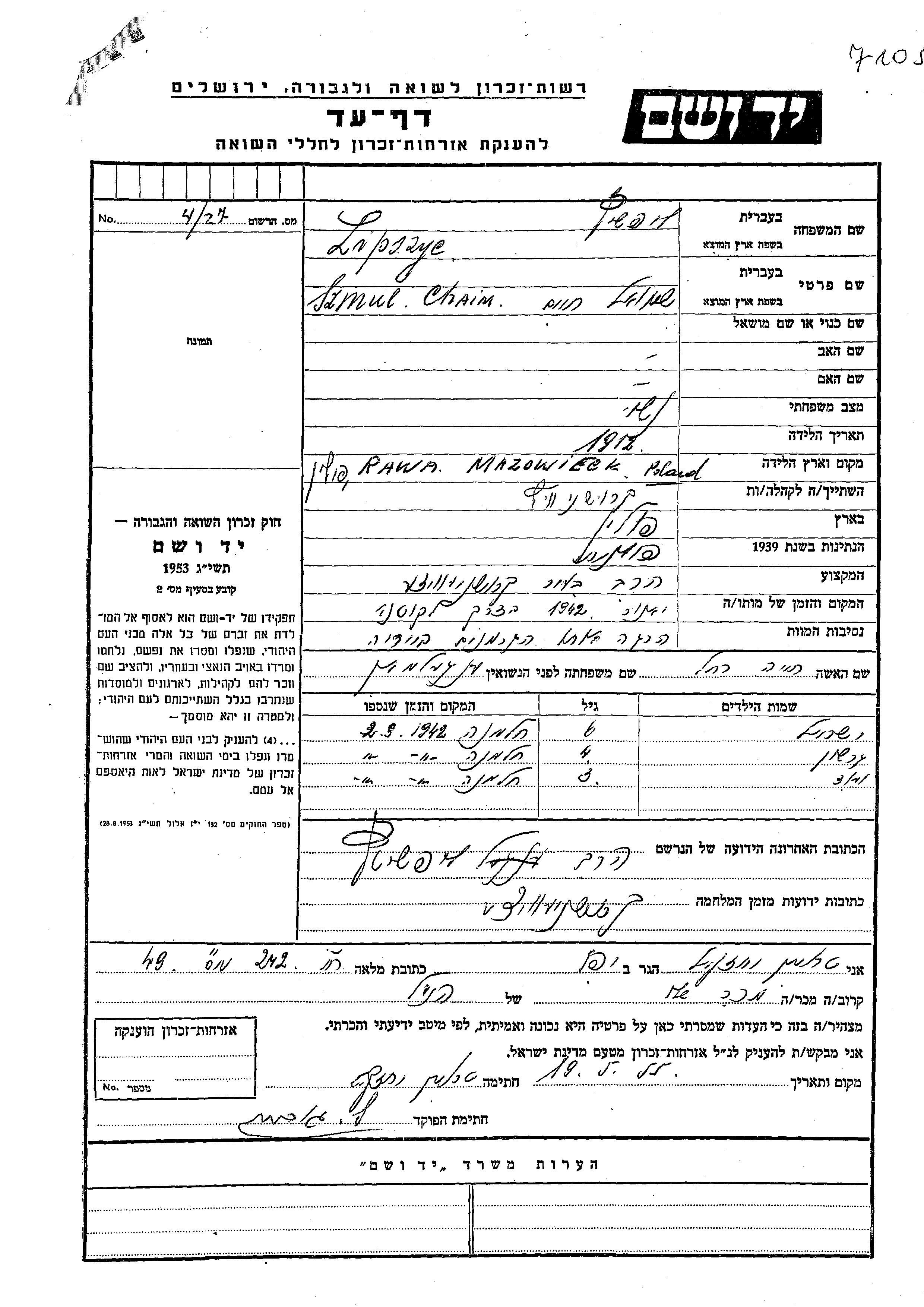 Veivel Lipszyc wurde Er war der Sohn von Szmul Chaim und Khaia Rakhel, geb. Engelman. Er war Kind. Vor dem Zweiten Weltkrieg lebte er in Krosniewice, Polen. Während des Krieges war er in Krosniewice, Polen.