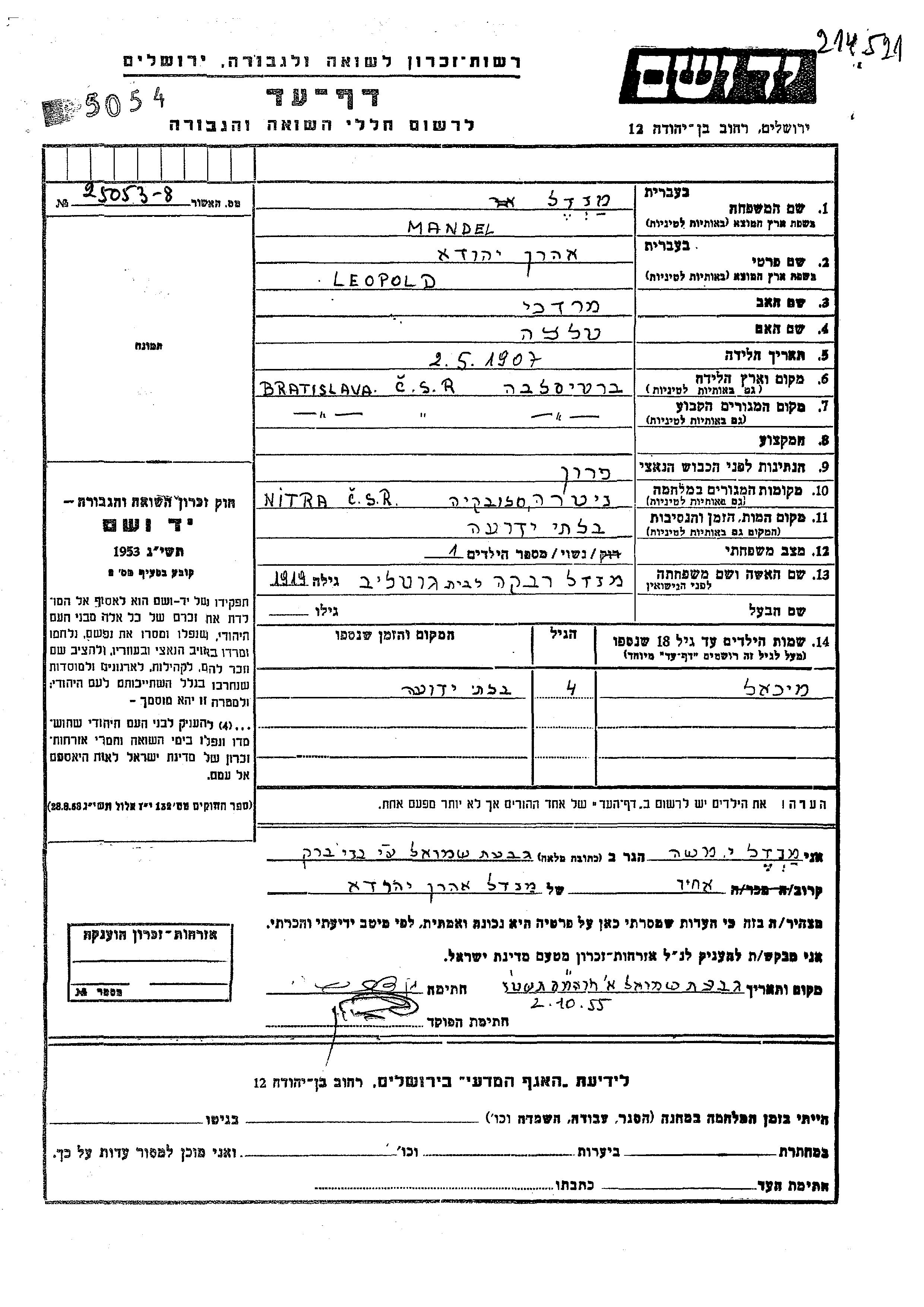 Mikhael Mandel wurde Er/sie war der/ die Sohn/Tochter von Aharon Yehuda Leopold und Rivka, geb. Gotlib. Er/Sie war Kind. Vor dem Zweiten Weltkrieg er/sie in Bratislava, Tschechoslowakei. Während des Krieges war er/sie in Nitra, Tschechoslowakei.