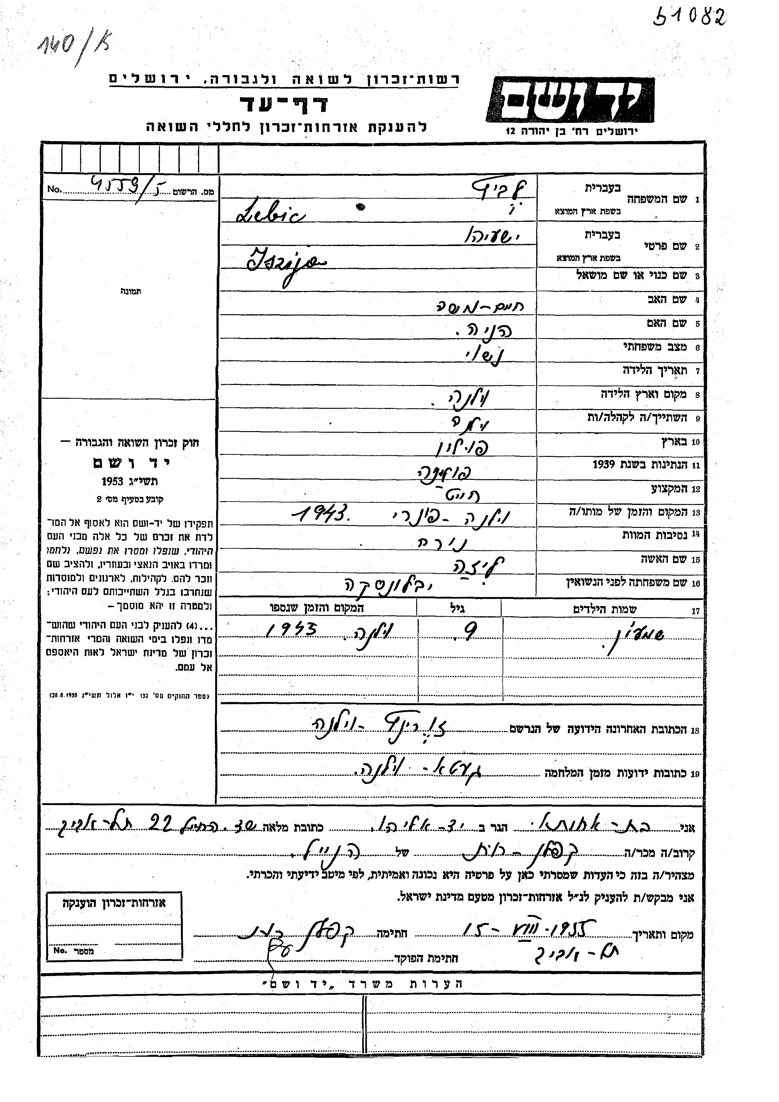 Shimon Lebic wurde Er war der Sohn von Jszija und Liza, geb. Iablonski. Er war Kind. Vor dem Zweiten Weltkrieg lebte er in Wilna, Polen. Während des Krieges war er in Wilna, Polen.