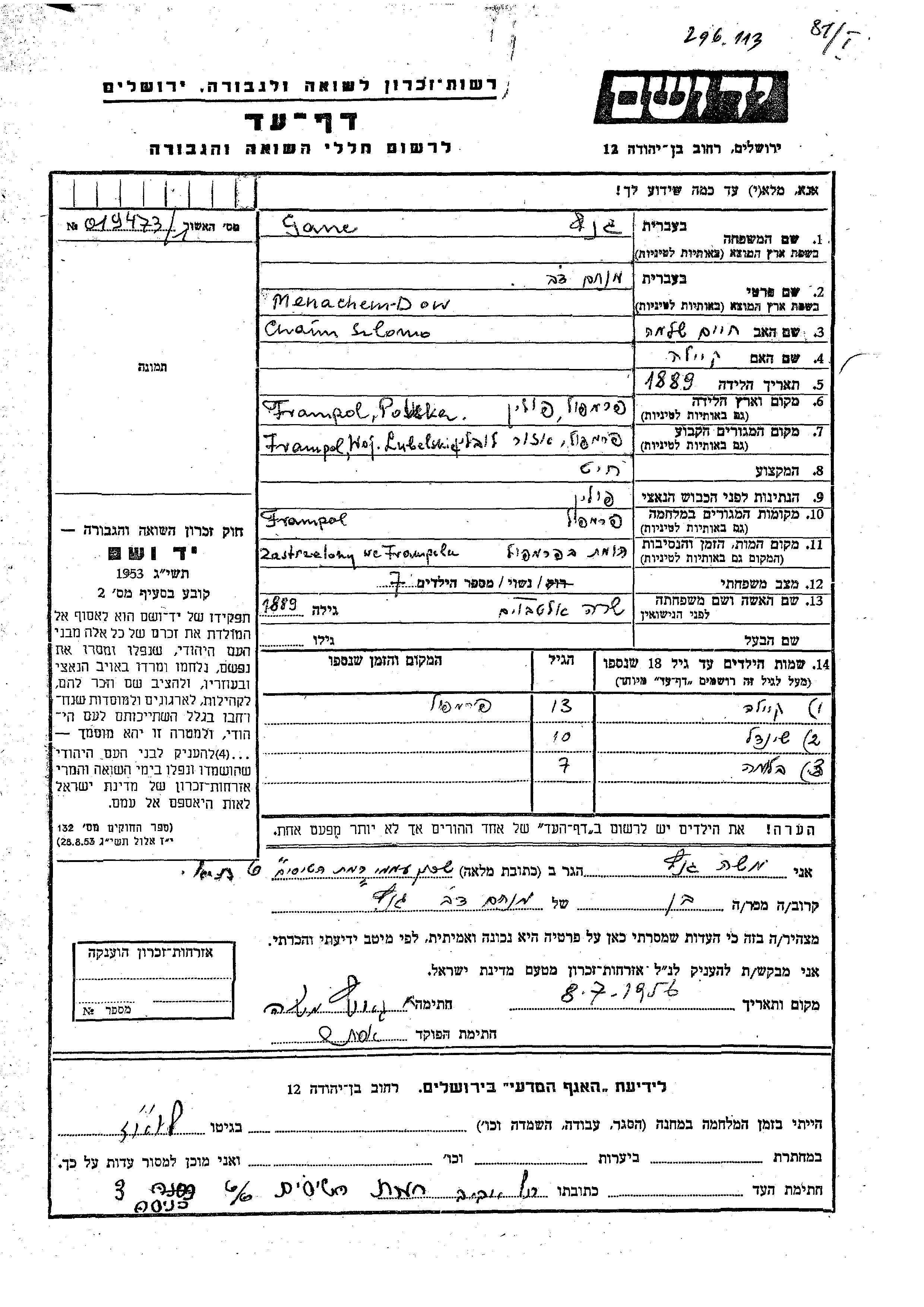 Ganc Keila Frampol, Polen Gedenkblatt