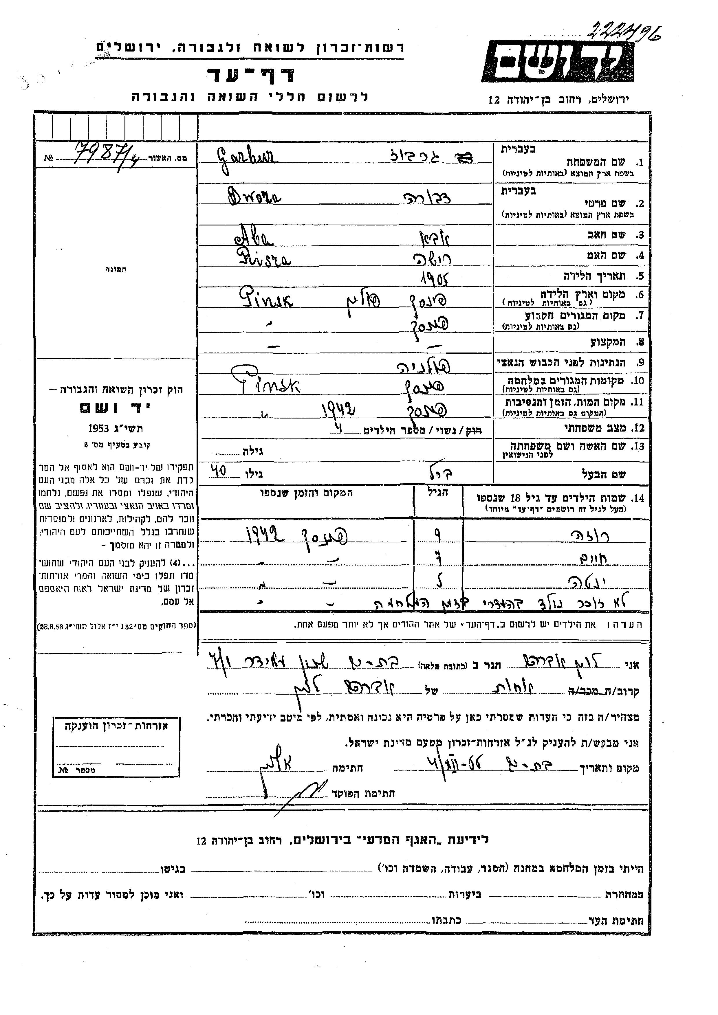 Yenta Garbuz wurde Er/sie war der/ die Sohn/Tochter von Berl und Dwora. Er/Sie war Kind. Vor dem Zweiten Weltkrieg er/sie in Pinsk, Polen. Während des Krieges war er/sie in Pinsk, Polen.