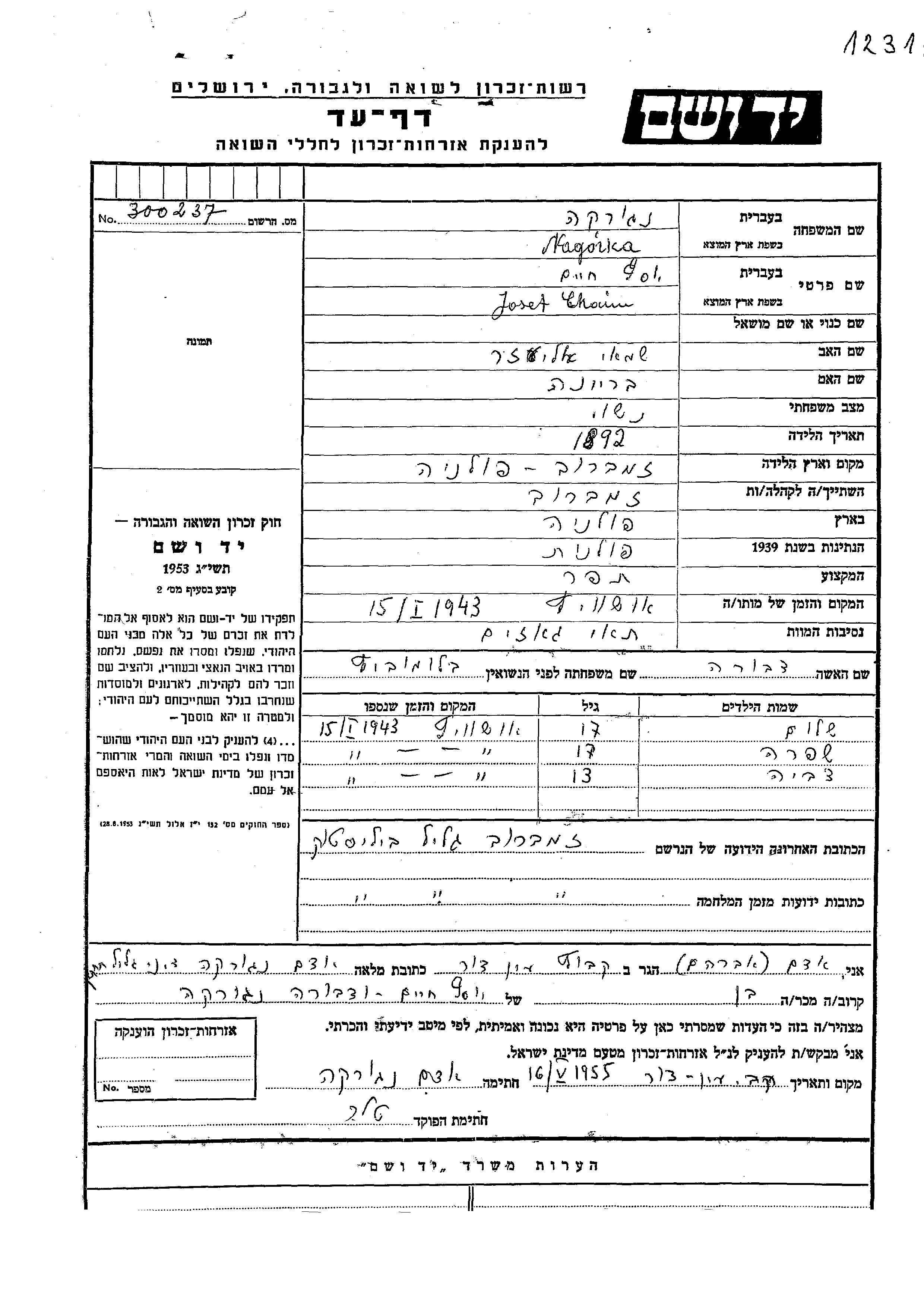 Nagórka Tzvia Zambrov, Polen Gedenkblatt
