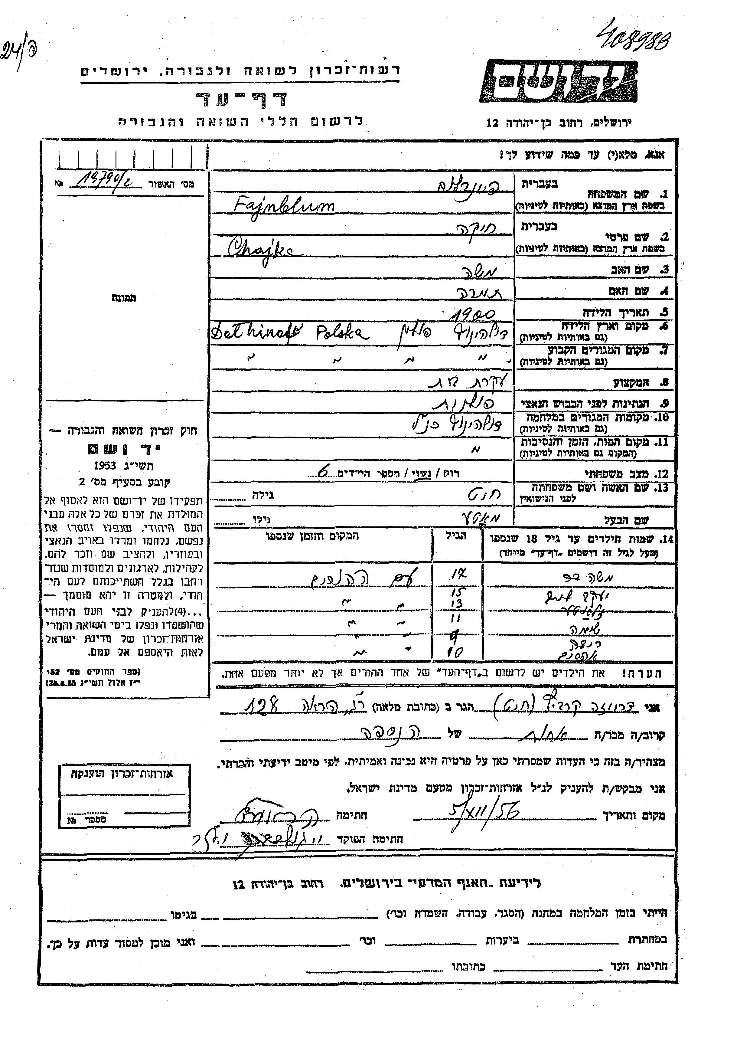 Efraim Fajnblum wurde Er war der Sohn von Mordekhai und Chajke, geb. Khaiat. Er war Kind. Vor dem Zweiten Weltkrieg lebte er in Dolhinov, Polen. Während des Krieges war er in Dolhinov, Polen.