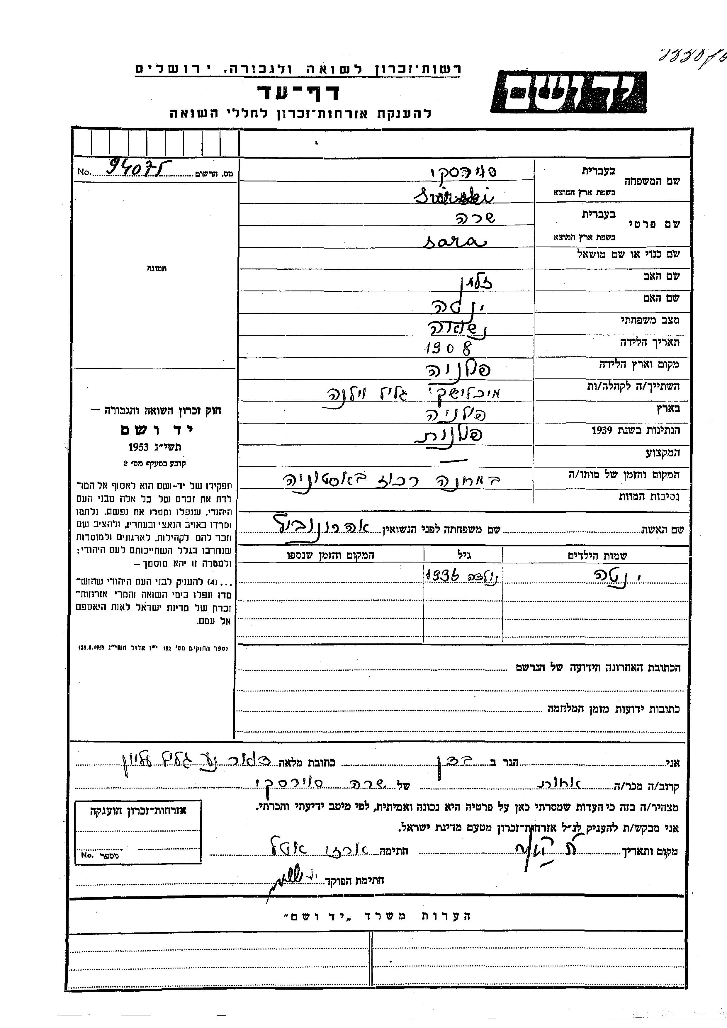 Yenta Swirski wurde im Jahr 1936 geboren. Er/sie war der/ die Sohn/Tochter von Sara, geb. Ahronovitz. Er/Sie war Kind. Vor dem Zweiten Weltkrieg er/sie in Polen.