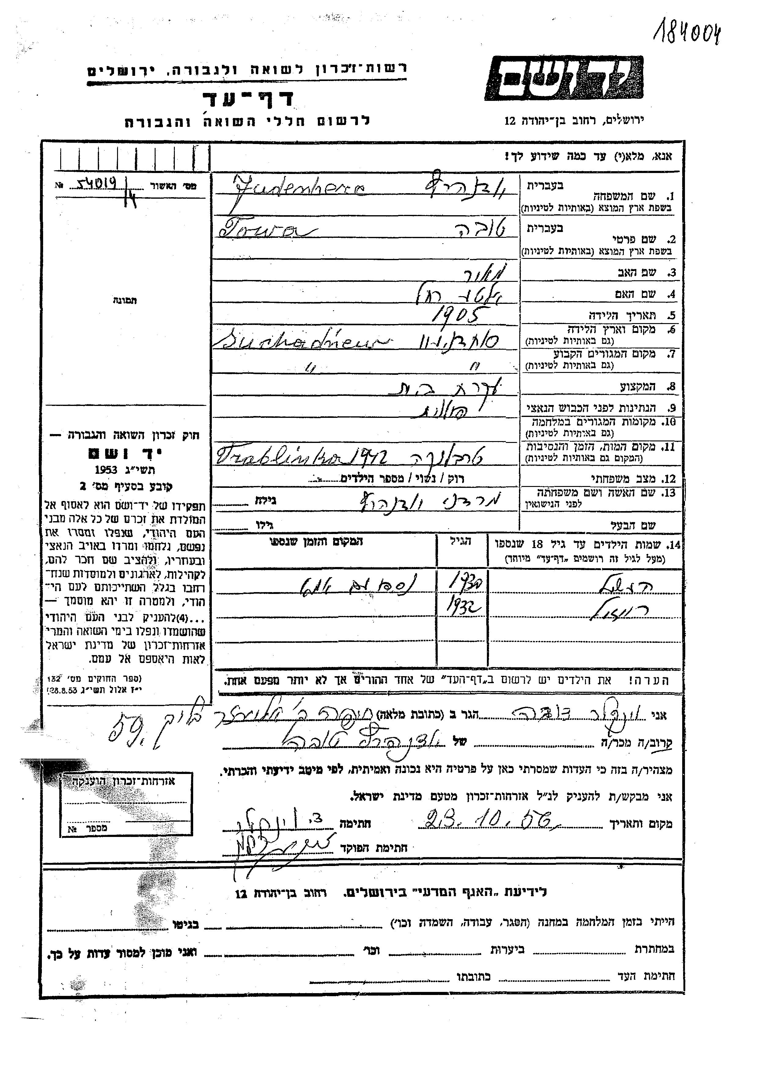 Reizl Judenherc wurde im Jahr 1932 geboren. Sie war die Tochter von Mordekhai und Towa. Sie war Kind. Vor dem Zweiten Weltkrieg lebte sie in Suchedniev, Polen.