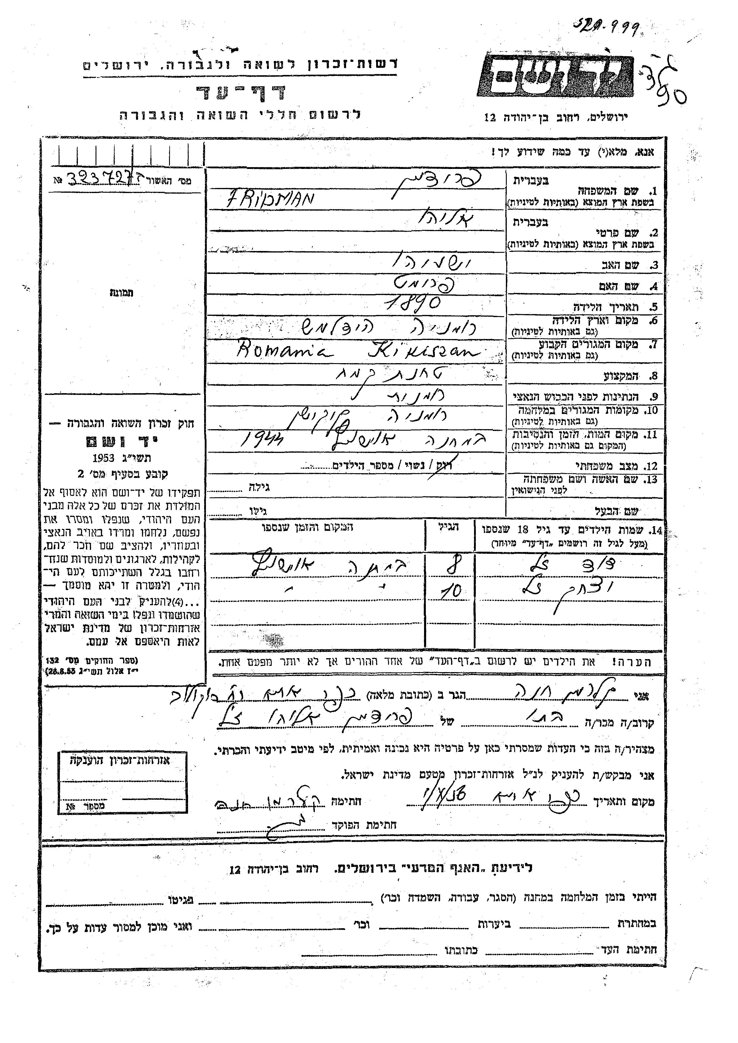 David Fridman wurde Er war der Sohn von Eliahu. Er war Kind. Vor dem Zweiten Weltkrieg lebte er in Chichisa, Rumänien. Während des Krieges war er in Chichisa, Rumänien.