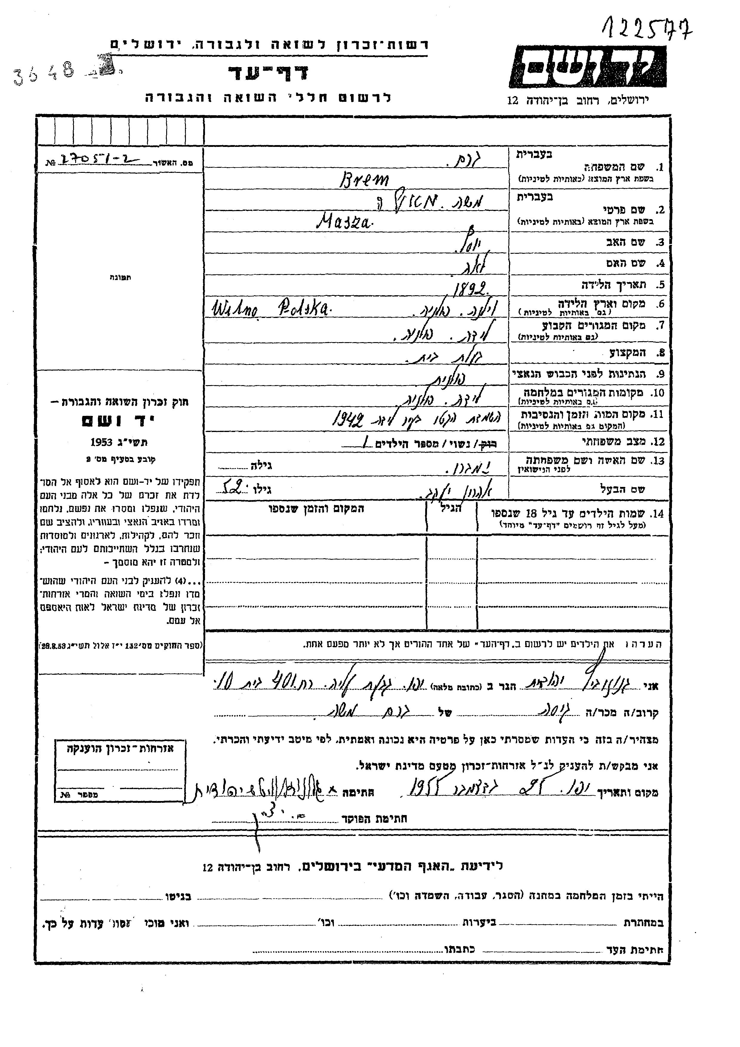 Masza Moshe Brem, geb. Yambro wurde im Jahr 1892 in Wilno, Polen geboren. Sie war die Tochter von Yosef und Lea. Sie war Hausfrau und mit Aharon Yaakov Verheiratet. Vor dem Zweiten Weltkrieg lebte sie in Lida, Polen. Während des Krieges war sie in Lida, Polen.