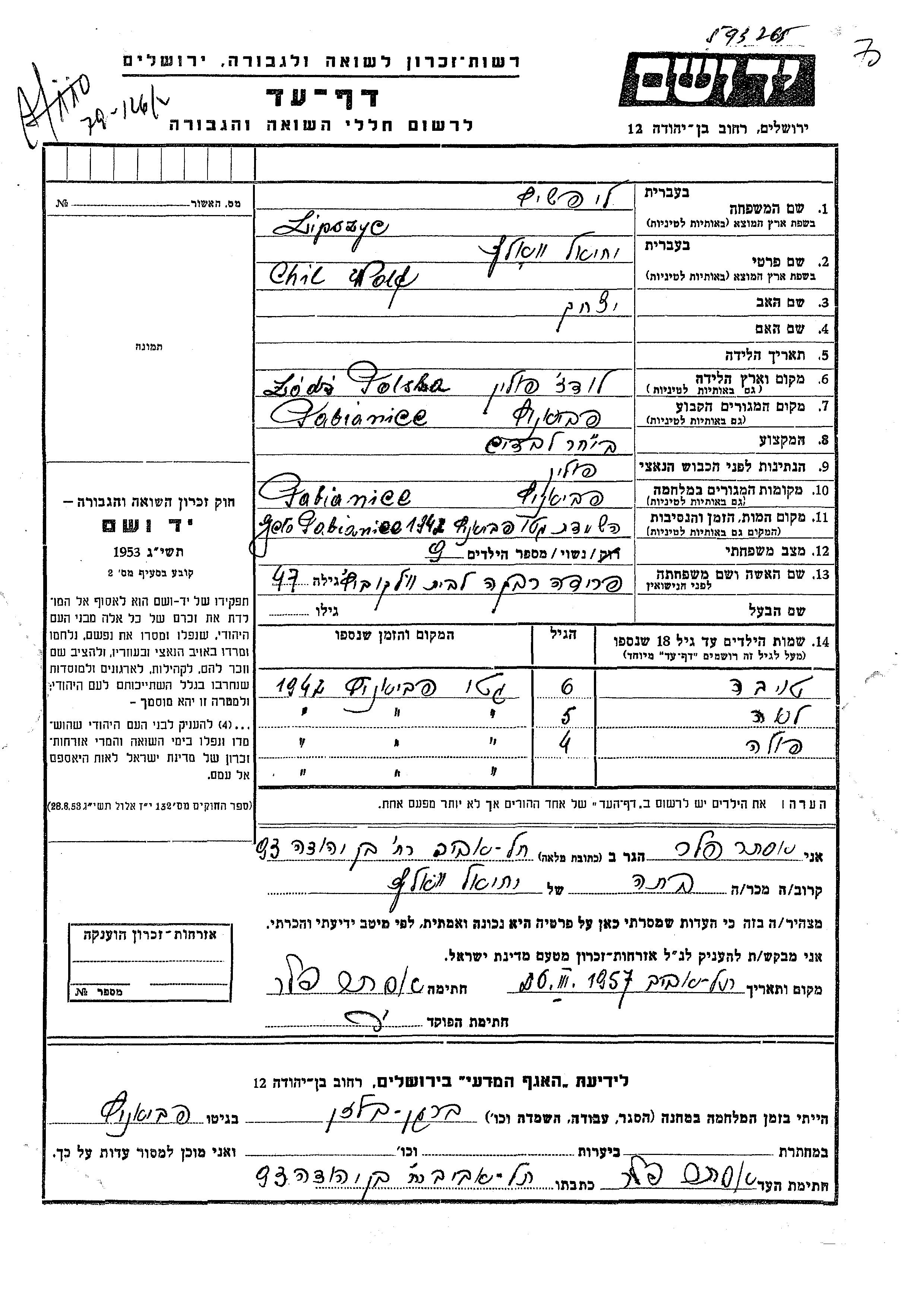 Lea Lipszyc wurde Sie war die Tochter von Chil Wolf und Frida Rivka, geb. Volkovitz. Sie war Kind. Vor dem Zweiten Weltkrieg lebte sie in Pabianice, Polen. Während des Krieges war sie in Pabianice, Polen.