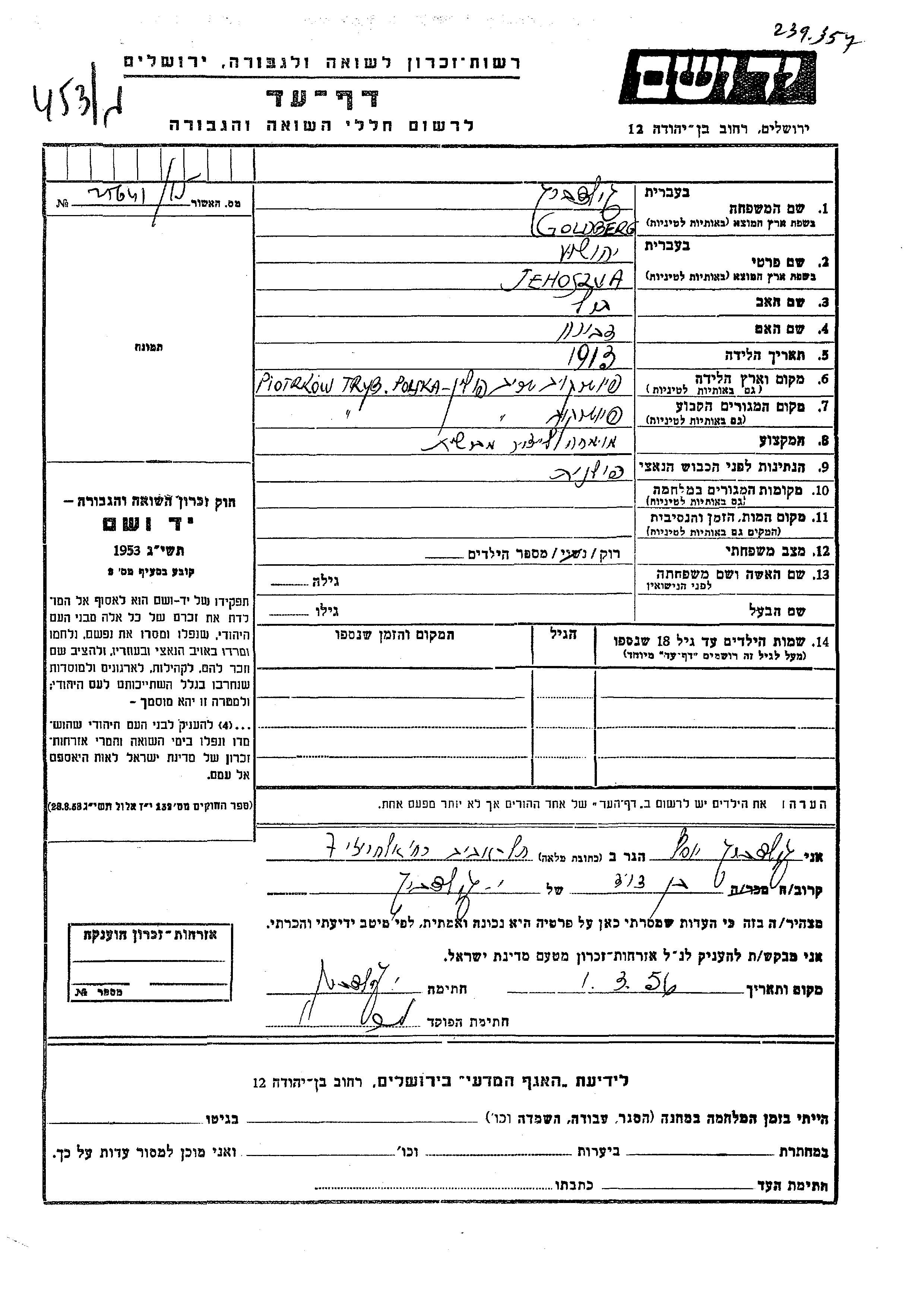 Jehoszua Goldberg wurde im Jahr 1913 in Piotrkow Trybunalski, Polen geboren. Er war der Sohn von Berl und Dvora. Er war Bürstenmacher und Ledig. Vor dem Zweiten Weltkrieg lebte er in Piotrkow Trybunalski, Polen.