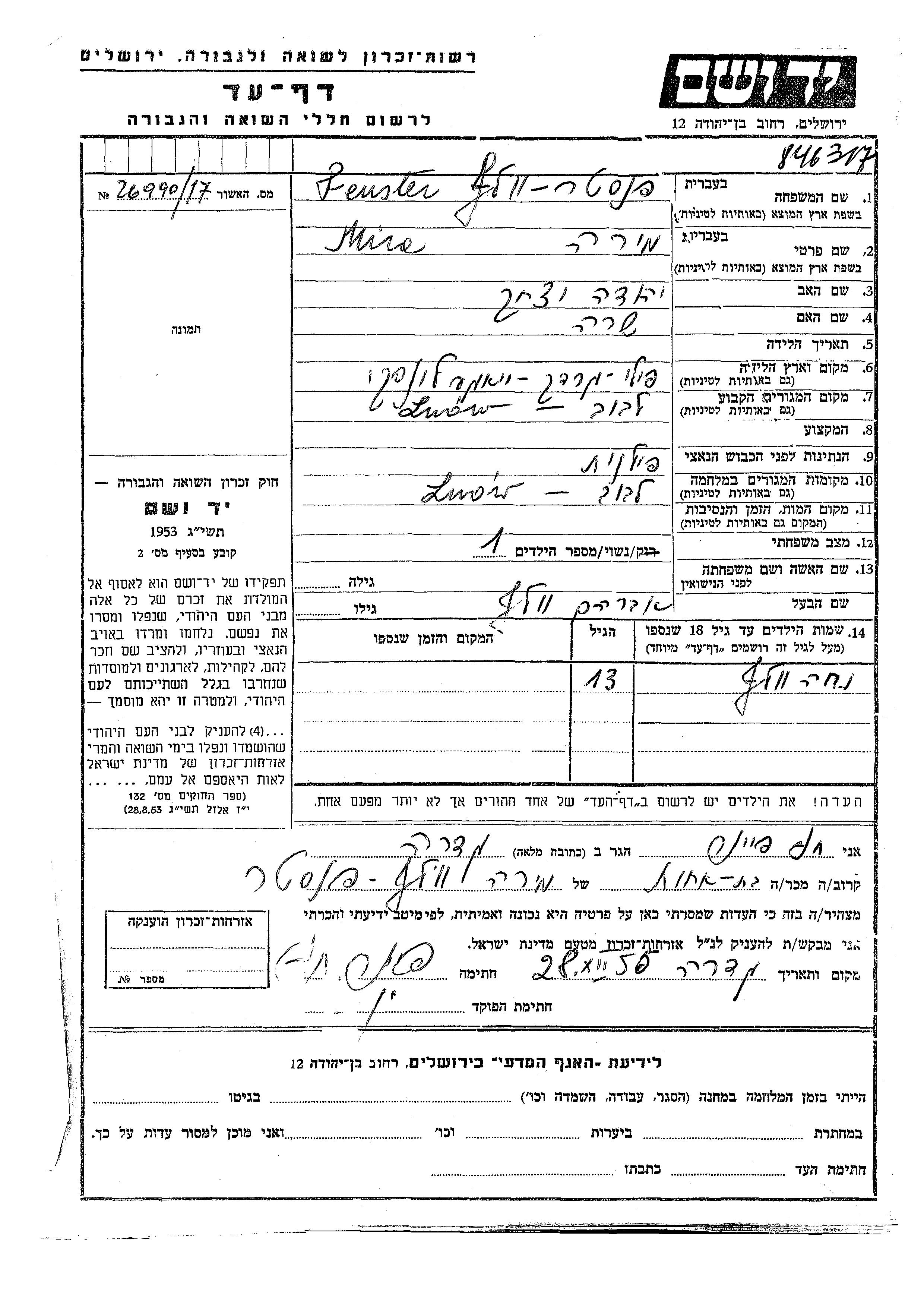 Nekha Fenster Volf wurde Sie war die Tochter von Avraham und Mira, geb. Fenster. Sie war Kind. Vor dem Zweiten Weltkrieg lebte sie in Lwow, Polen. Während des Krieges war sie in Lwow, Polen.