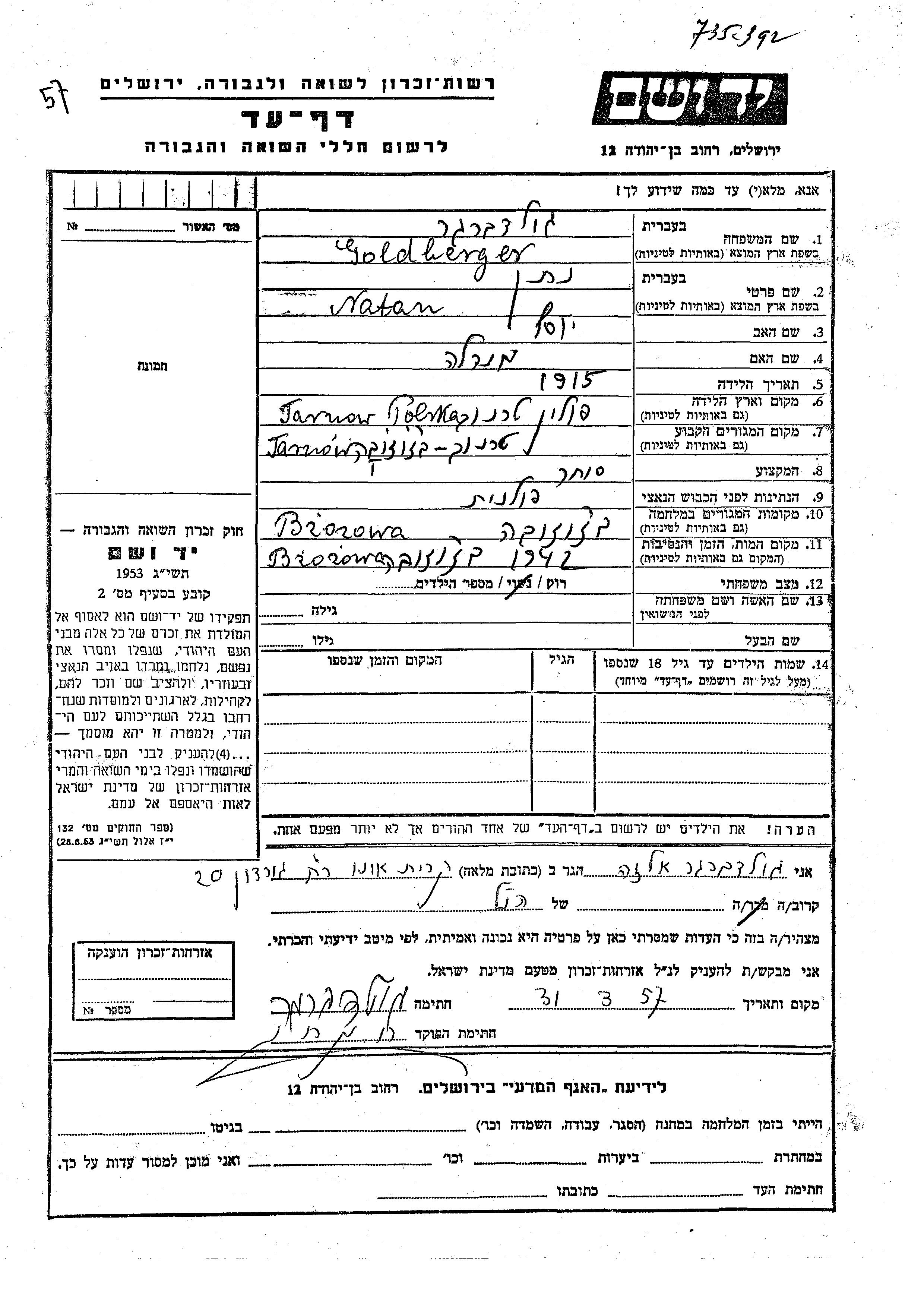 Natan Goldberger wurde im Jahr 1915 in Tarnow, Polen geboren. Er war der Sohn von Yosef und Mendel. Er war Kaufmann/-frau und Ledig. Vor dem Zweiten Weltkrieg lebte er in Tarnow, Polen. Während des Krieges war er in Brzozowa, Polen.
