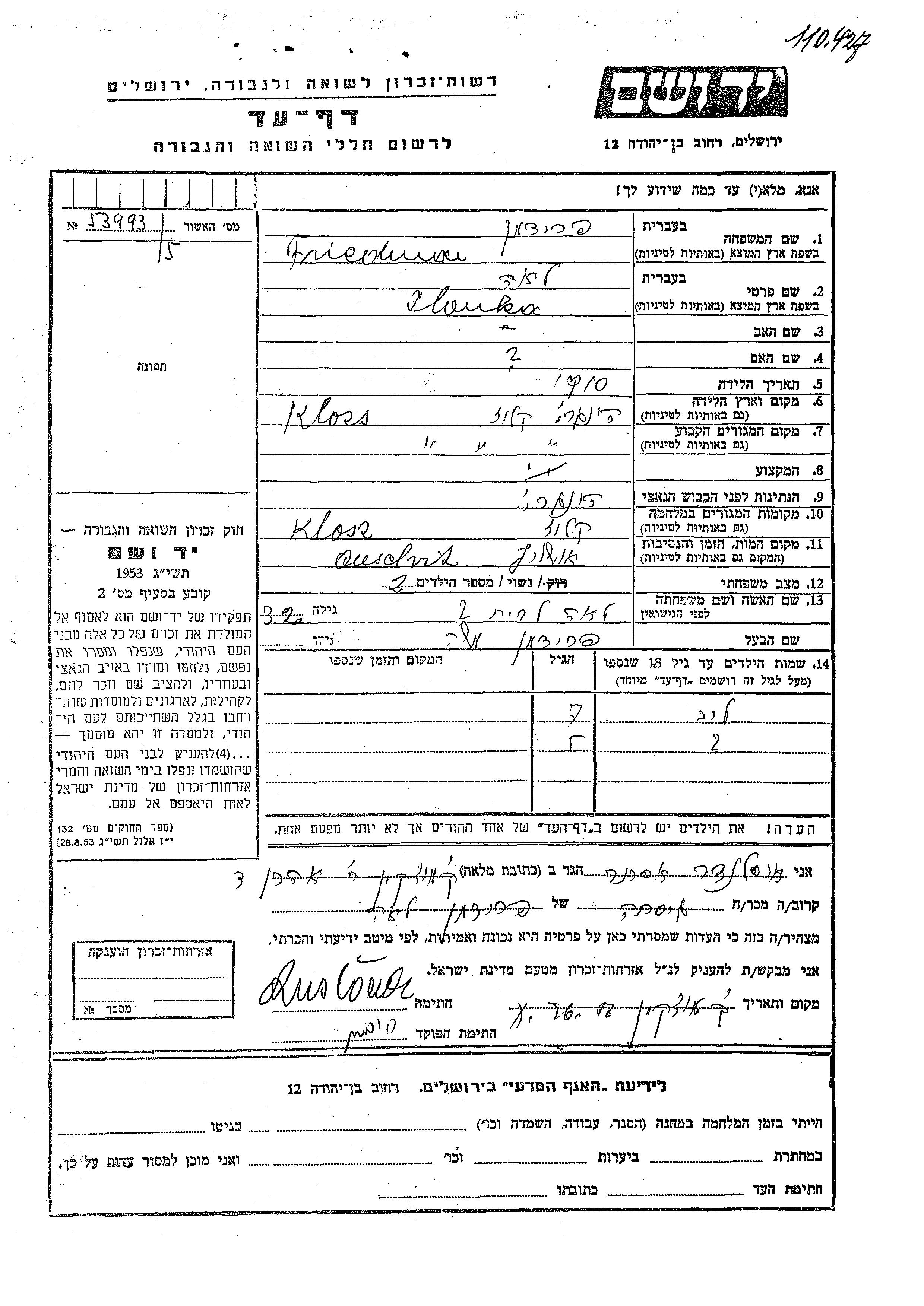 Leib Friedman wurde Er war der Sohn von Moshe und Zlonka Lea. Er war Kind. Vor dem Zweiten Weltkrieg lebte er in Kluzs, Rumänien. Während des Krieges war er in Kluzs, Rumänien.
