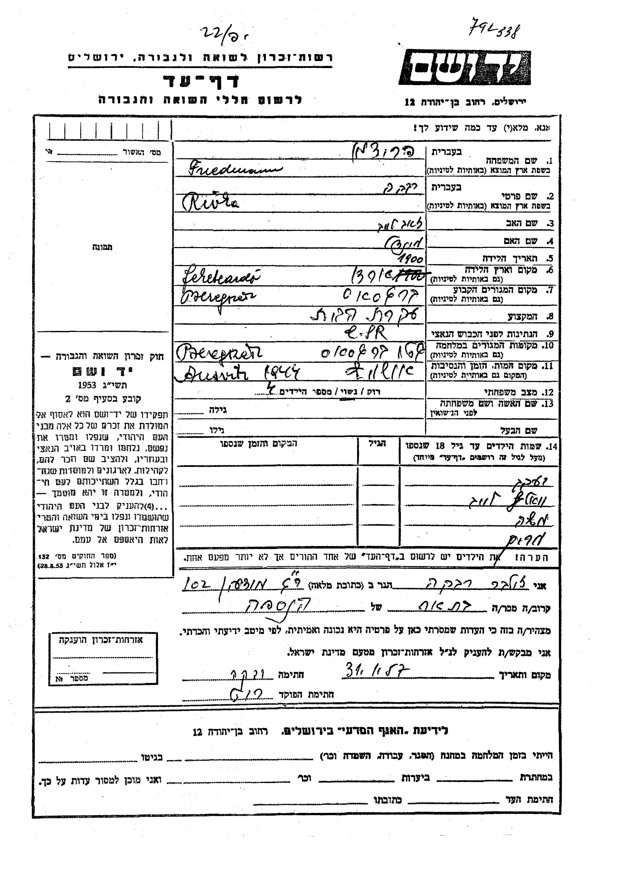 Yaakov Friedman wurde Er war der Sohn von Rivka. Er war Kind. Vor dem Zweiten Weltkrieg lebte er in Beregszasz, Tschechoslowakei. Während des Krieges war er in Beregszasz, Tschechoslowakei.