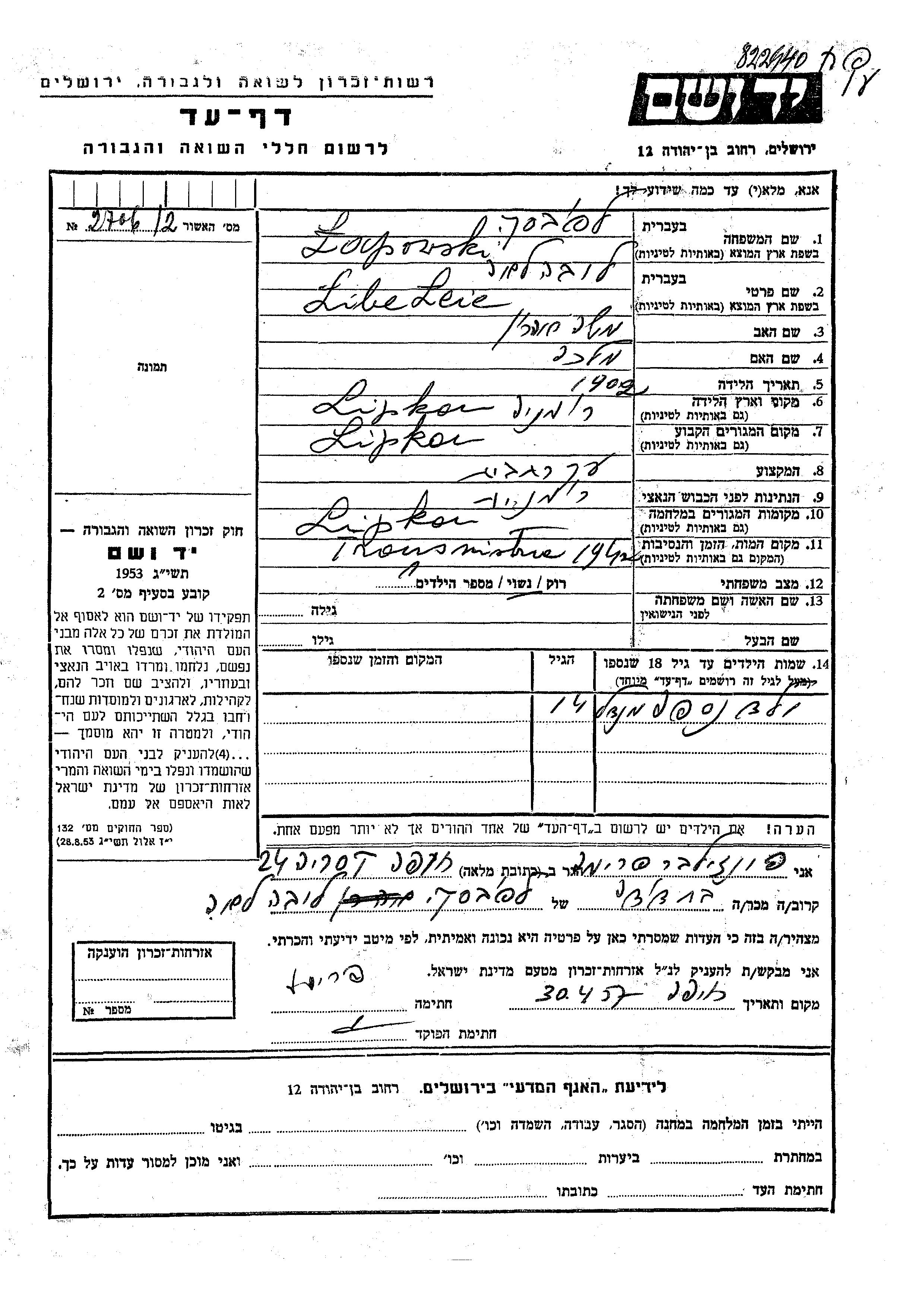 Mendel Lapowski wurde Er war der Sohn von Liba Leie. Er war Kind. Vor dem Zweiten Weltkrieg lebte er in Lipkani, Rumänien. Während des Krieges war er in Lipkani, Rumänien.