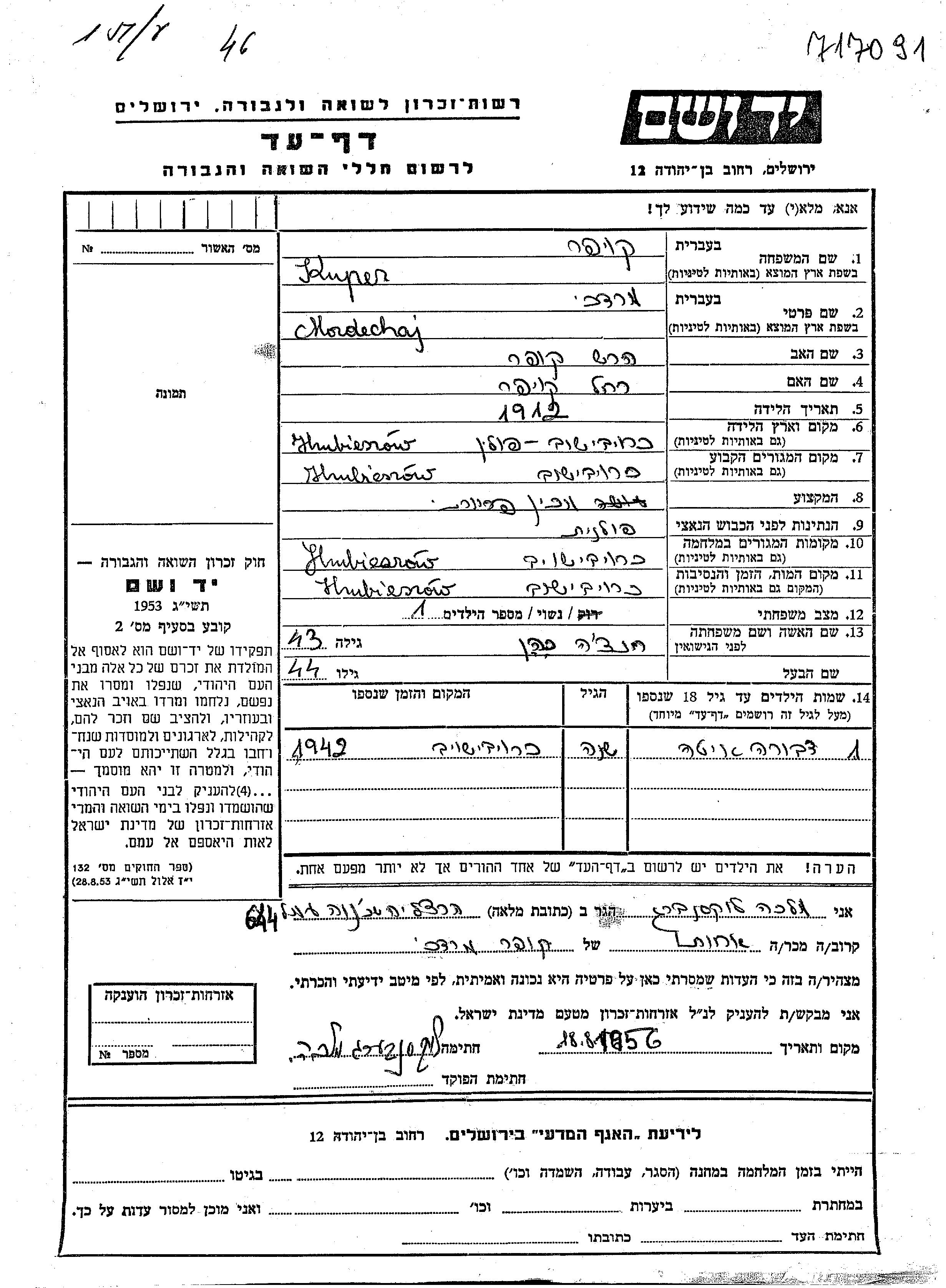 Dvora Ita Kuper wurde Sie war die Tochter von Mordechaj und Hencha, geb. Kohen. Sie war Kind. Vor dem Zweiten Weltkrieg lebte sie in Hrubieszow, Polen. Während des Krieges war sie in Hrubieszow, Polen.