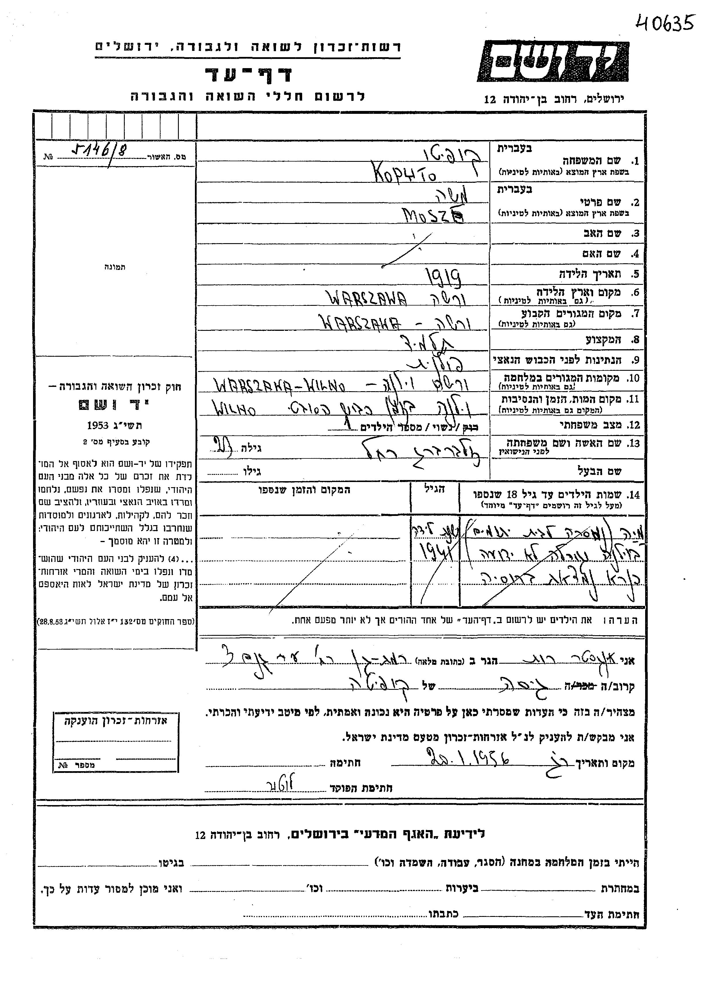 Mia Kopyto wurde im Jahr 1941 geboren. Sie war die Tochter von Mosze und Rakhel, geb. Zilberberg. Sie war Kind. Vor dem Zweiten Weltkrieg lebte sie in Warsaw, Polen. Während des Krieges war sie in Wilno, Polen.