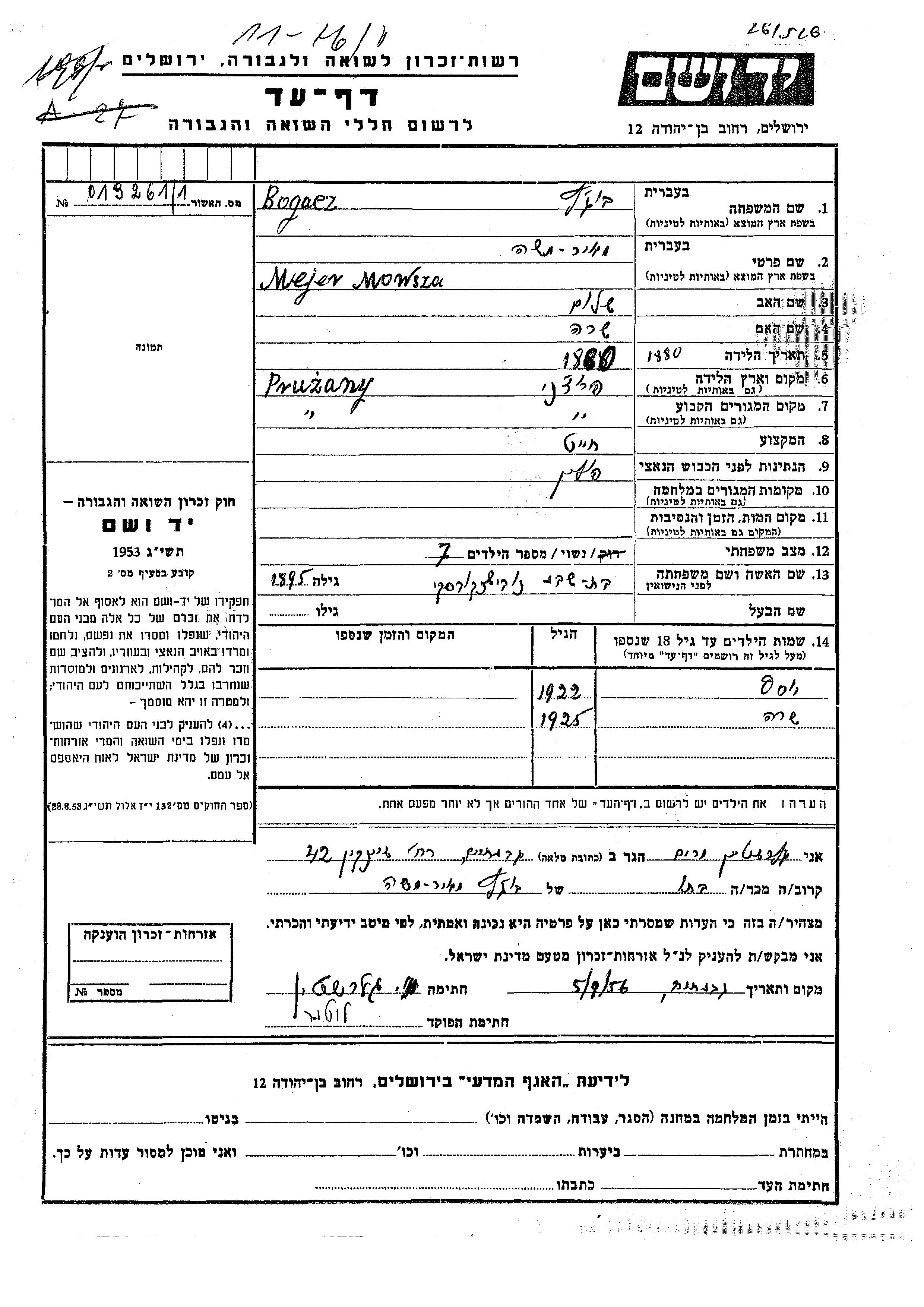 Bogacz Yosef 1922 Pruzany, Polen Gedenkblatt