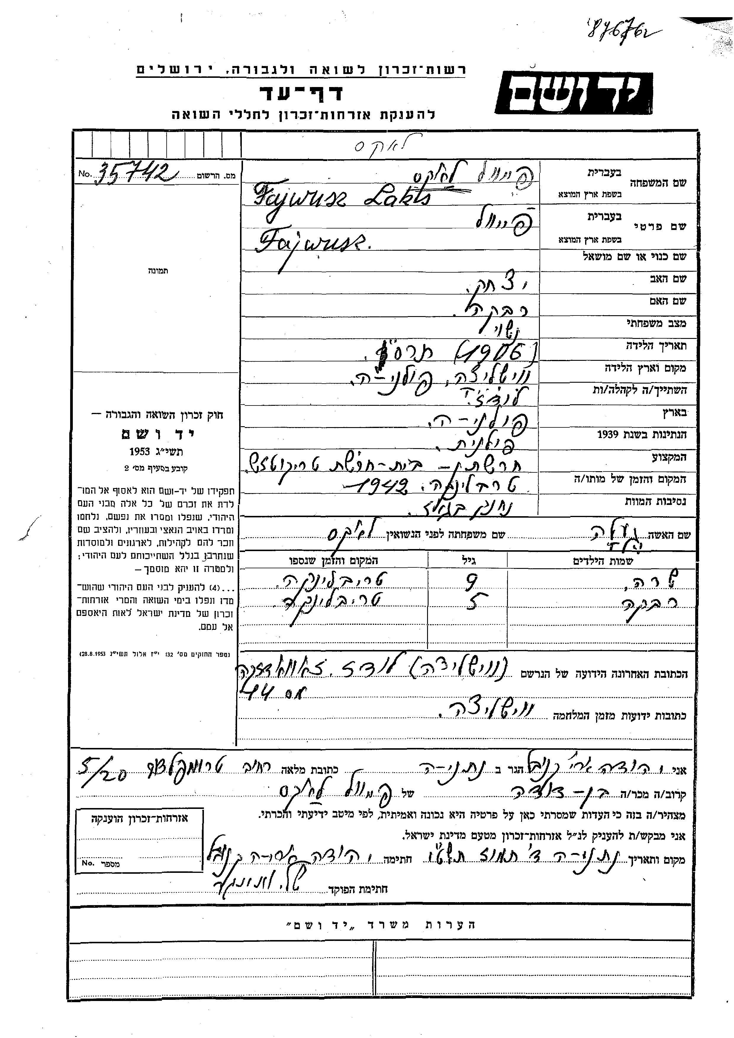 Sara Laks wurde Sie war die Tochter von Fajwusz und Gela. Sie war Kind. Vor dem Zweiten Weltkrieg lebte sie in Lodz, Polen. Während des Krieges war sie in Wishlica, Polen.