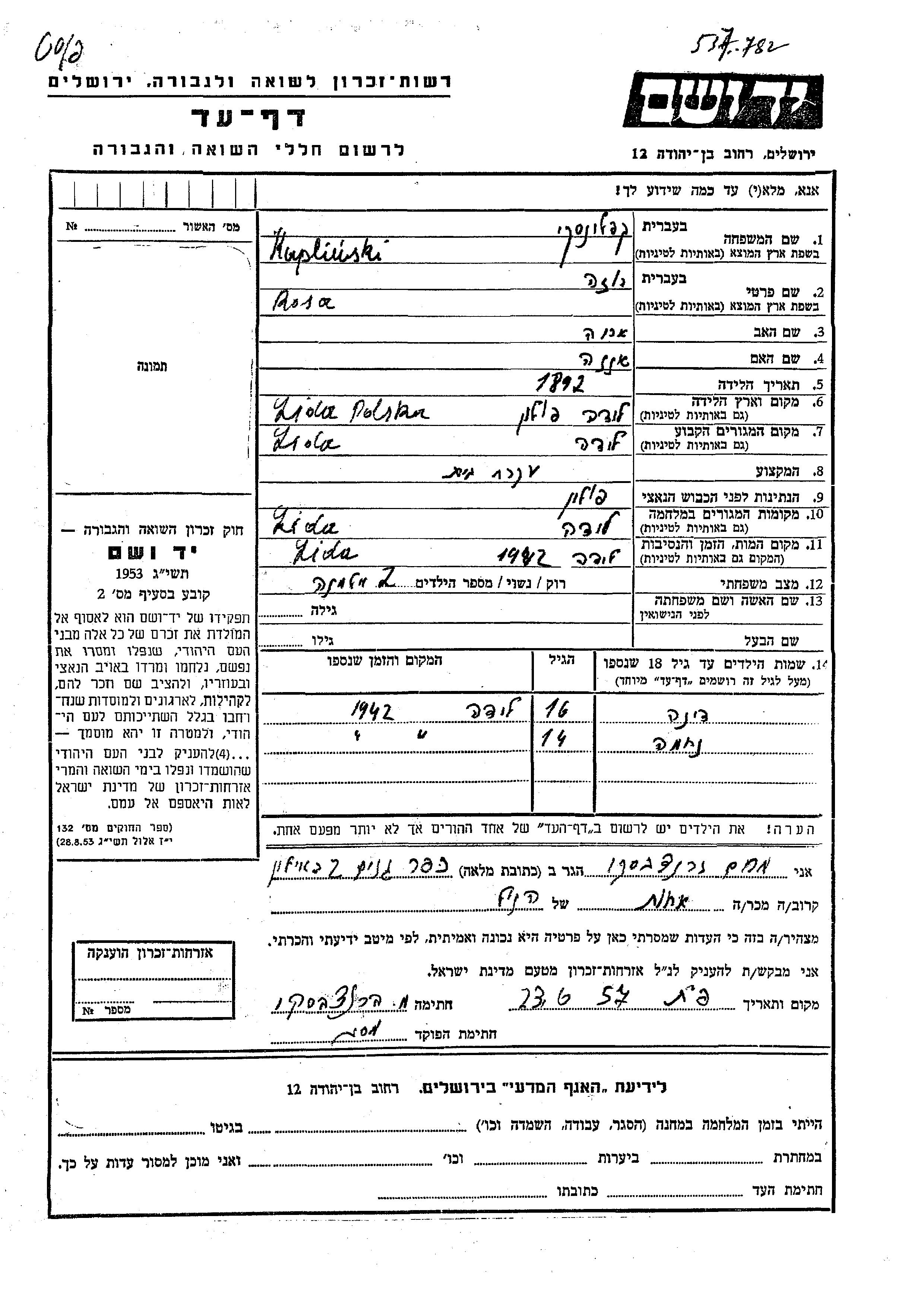 Nekhama Kuplinski Kaplinski wurde Er/sie war der/ die Sohn/Tochter von Rosa. Er/Sie war Kind. Vor dem Zweiten Weltkrieg er/sie in Lida, Polen. Während des Krieges war er/sie in Lida, Polen.